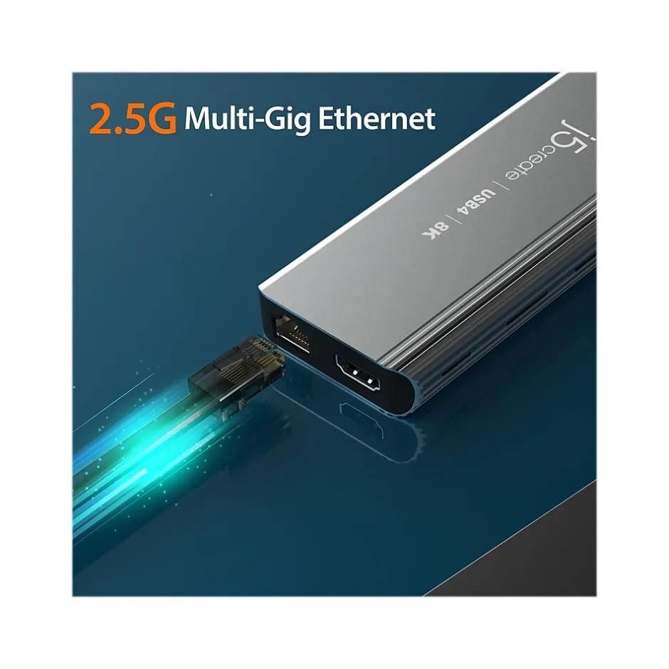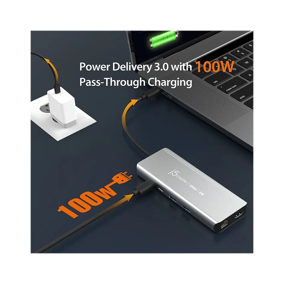 This j5create high-performance USB4 multi-port hub incorporates a state-of-the-art USB4 controller, offering compatibility with Thunderbolt 4/3 and older USB specifications. With up to 40Gbps of aggregate throughput, dynamic data and display bandwidth allocation for efficient display data flow, you can easily create a high-definition monitor setup. Enjoy resolutions up to 8K, and access data faster without affecting system performance. Additionally, the hub has three USB SuperSpeed+ 10Gbps ports (one USB Type-C and two USB Type-A) for charging or connecting peripherals. Also equipped with a USB Type-C Power Delivery port to charge your laptop and power your connected devices with up to 100W of pass-through power.