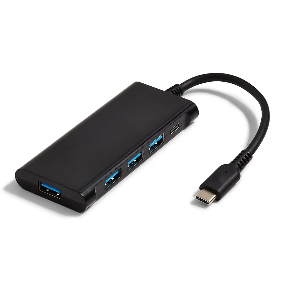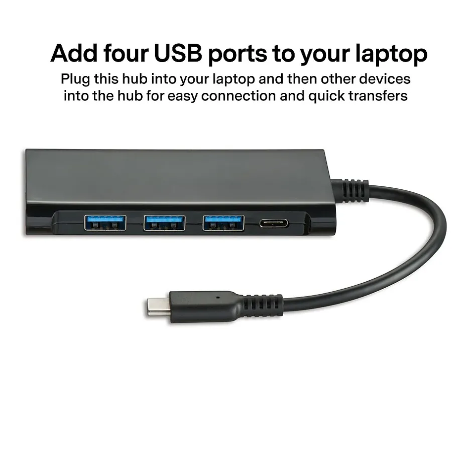 Add four USB ports to your USB-C laptop port with this connectivity hub. Featuring transfer speeds of up to 5Gbps, this adapter supports fast file copying and smooth video rendering. This NXT Technologies four-port USB-C to USB-A hub has a resilient design that endures up to 10000 bend cycles.