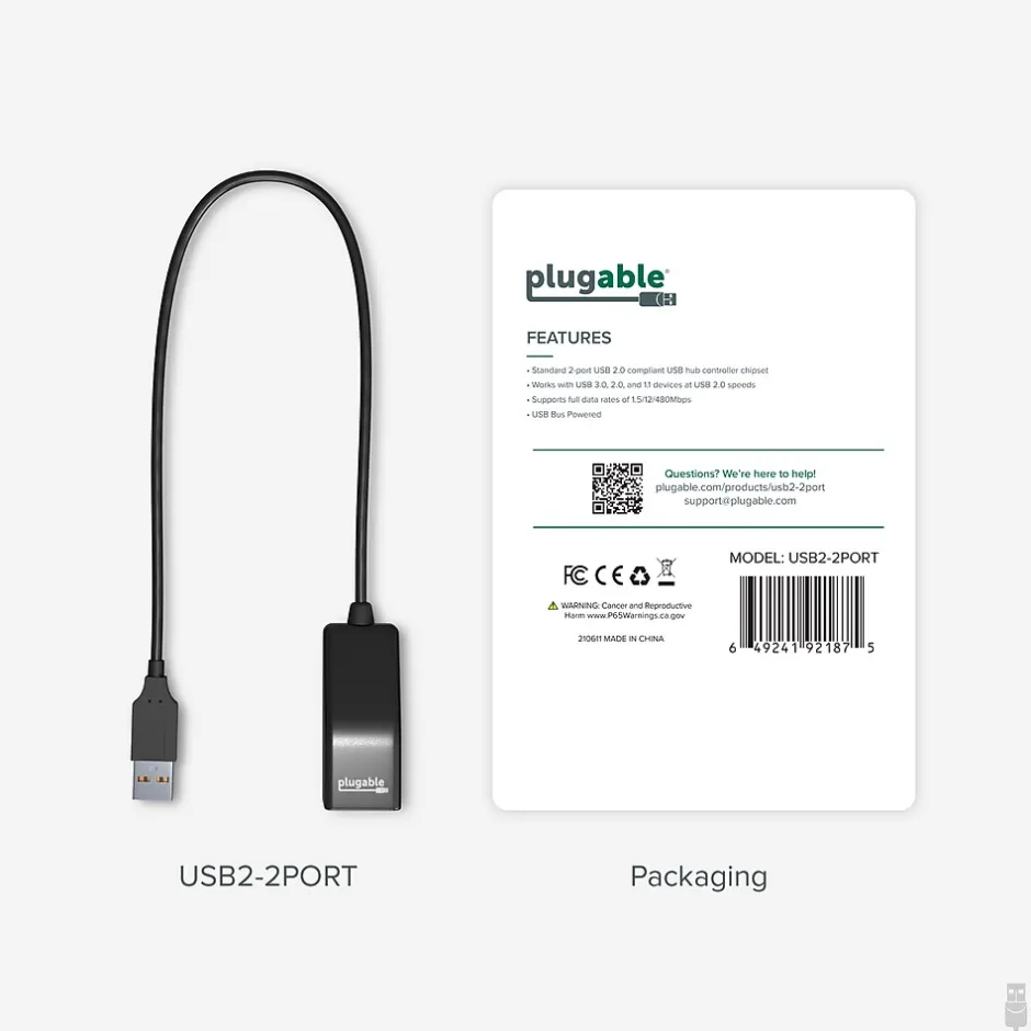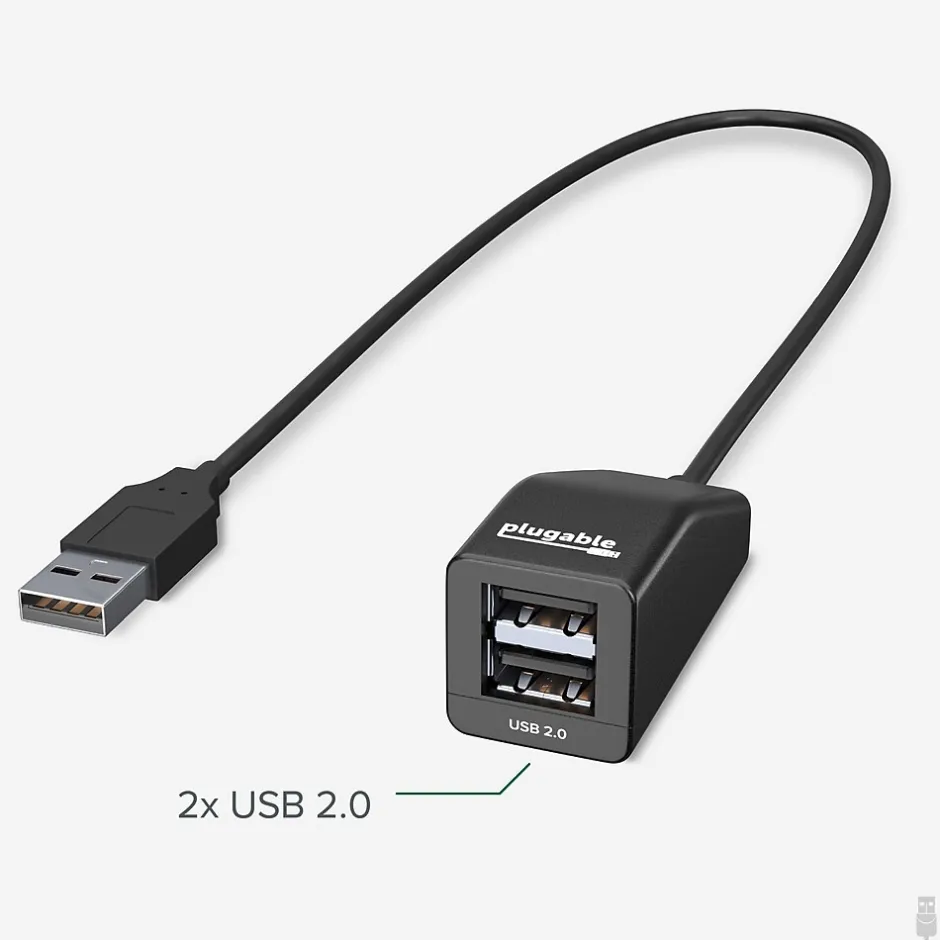 The Plugable piano black 2-port USB 2.0 hub/splitter is compatible with all USB 2.0 and 1.1 devices. This bus powered hub with in-line design, features compact construction to minimize cable clutter. This hub allows two devices to share a single available USB port. It is compatible with Microsoft Windows , Linux, OS X and Chrome OS.