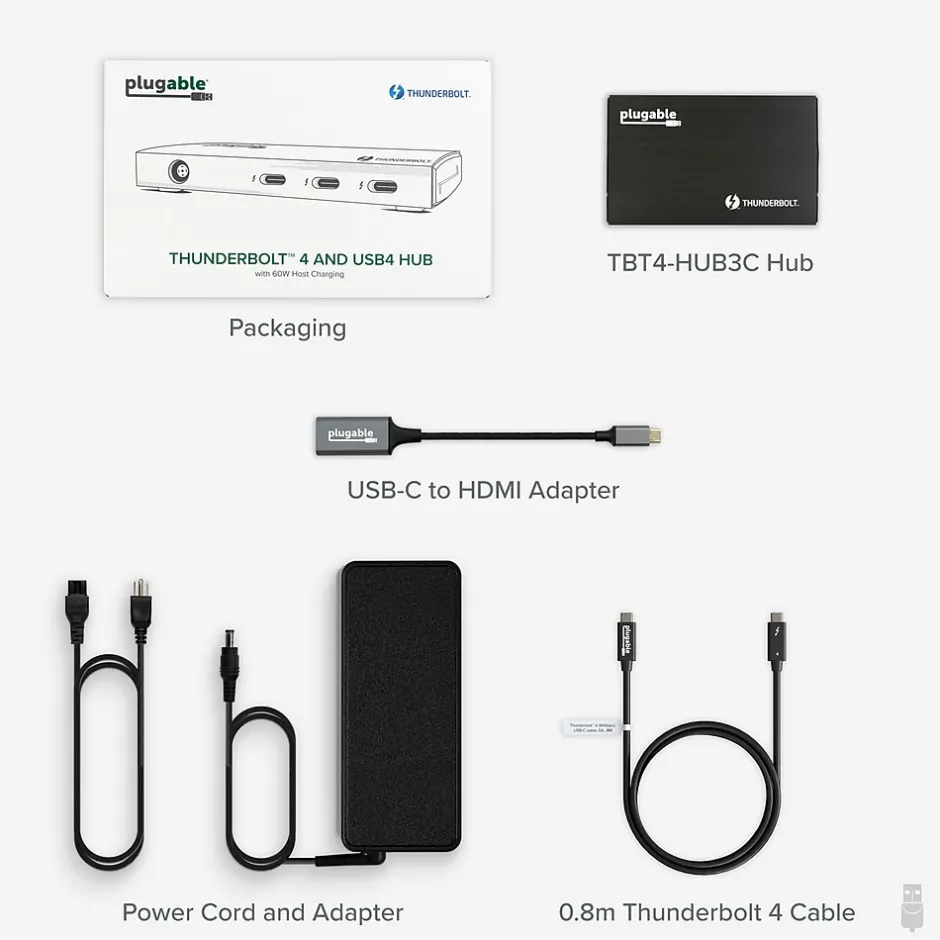 The Plugable Thunderbolt 4 and USB4 hub with 60W charging delivers an experience that you won’t find anywhere else. All of your devices—Thunderbolt 4, USB4, Thunderbolt 3, or USB-C — will automatically work at their peak potential as supported by the host. Everything you need for an excellent Windows or Macbook Pro hub. Here’s something you might not find with other hubs, an included USB-C to HDMI 2.0 adapter simplifies connecting an additional monitor, and the included 2.6′ Thunderbolt 4 cable gives you more flexibility to set up your desk.