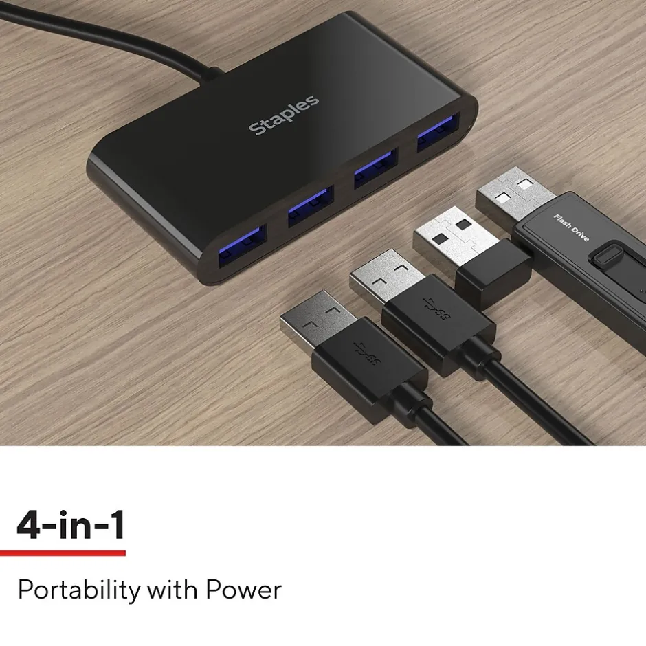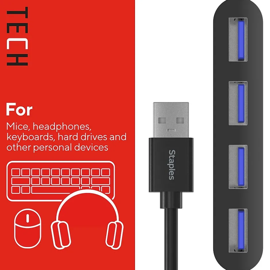 Never be without enough connection ports again. Connect USB-A peripheral devices – like mice, keyboards, headphones, and charging cords – for a completely connected workstation. Powered by USB 2.0, this hub promises fast data transfer speeds up to 480 Mbps. Measuring at just 3″ x 5″ this hub is compact and portable, perfect for on-the-go workers or smaller work spaces. Enjoy reliable and fast connectivity with the Staples TECH Four-Port Hub. Backed by Staples 100% Satisfaction Money Back Guarantee.