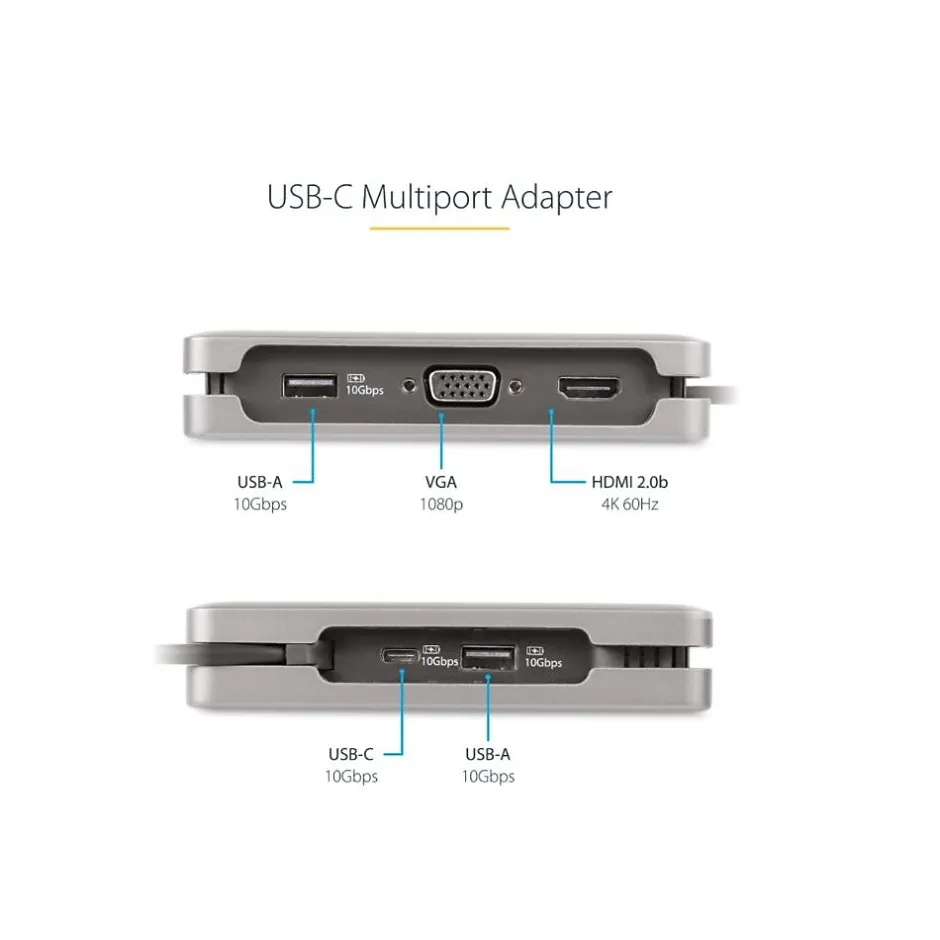 Connect this USB Type-C Multiport Adapter to a USB-C, USB4, or Thunderbolt 3/4™ laptop to enable single-display 4K 60Hz HDMI 2.0b or 1080p 60Hz VGA video output via DP Alt Mode. The USB-C dock works with USB Type-C laptops or tablets, such as a Chromebook, Dell XPS, or MacBook. It features a 3-Port USB 3.2 Gen 2 (10Gbps) Hub (2x USB-A, 1x USB-C), and Gigabit Ethernet. Connect the laptop USB-C power supply to the dedicated USB Power Delivery (PD) 3.0 port, to charge the laptop.