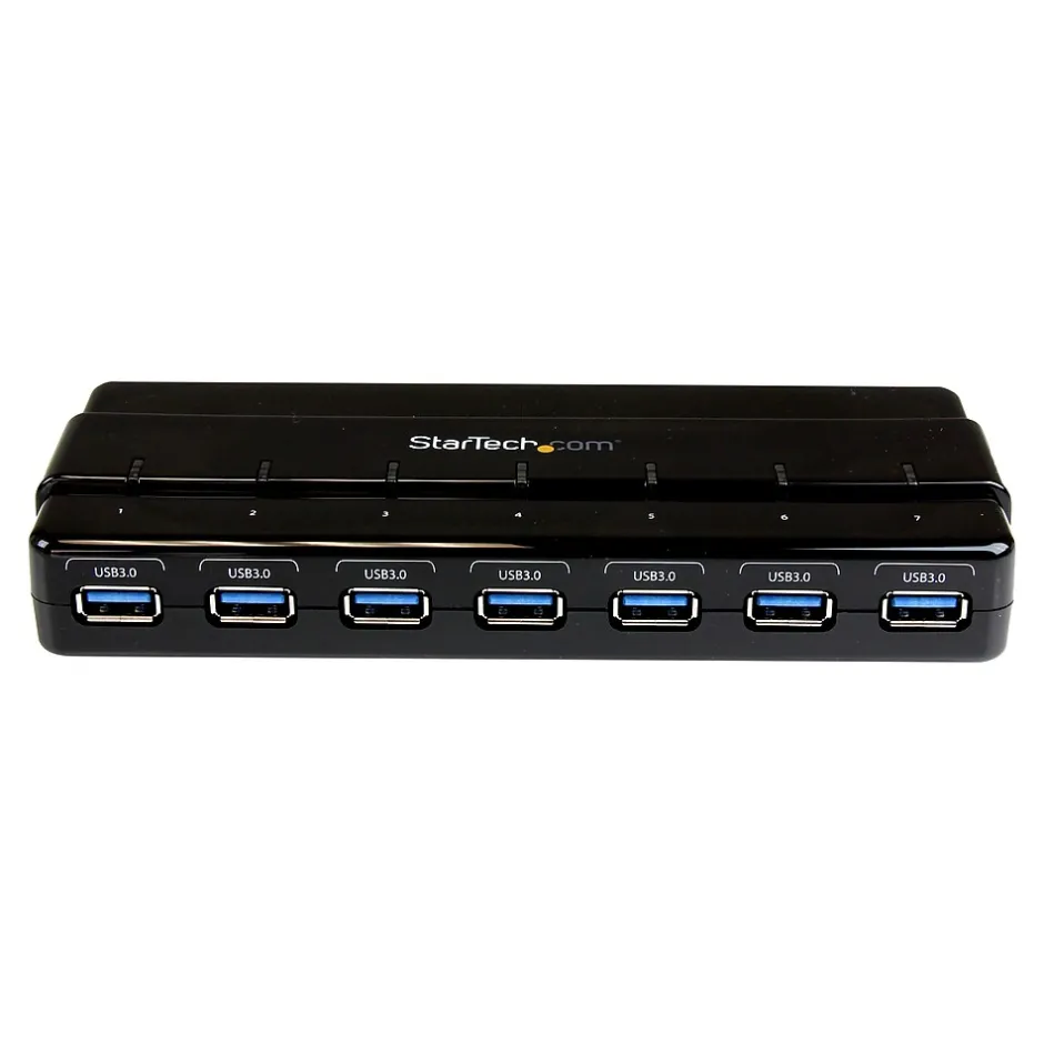 Expand your computer’s USB connectivity with this StarTech seven-port USB 3.0 hub. This device plugs into your computer and provides seven high-speed USB 3.0 ports that support data transfer rates of up to 5Gbps for rapid file transfers to and from storage media. The included power adapter makes this StarTech seven-port USB 3.0 hub ideal for connecting devices to notebooks without battery drain.
