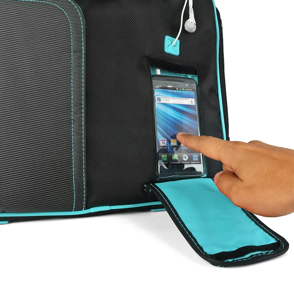 A tech savvy’s dream bag the Pindar has exterior accessory pockets for a tablet up to 8.5in x 9.5in and a phone or MP3 Player. A see through covering that does not interfere with touch screen capabilities holds your phone allowing for convenient song changes and viewing of emails without ever moving your device. The main compartment holds a laptop up to 17.3 inch and has opening side slots so your device can remain in the bag while charging.