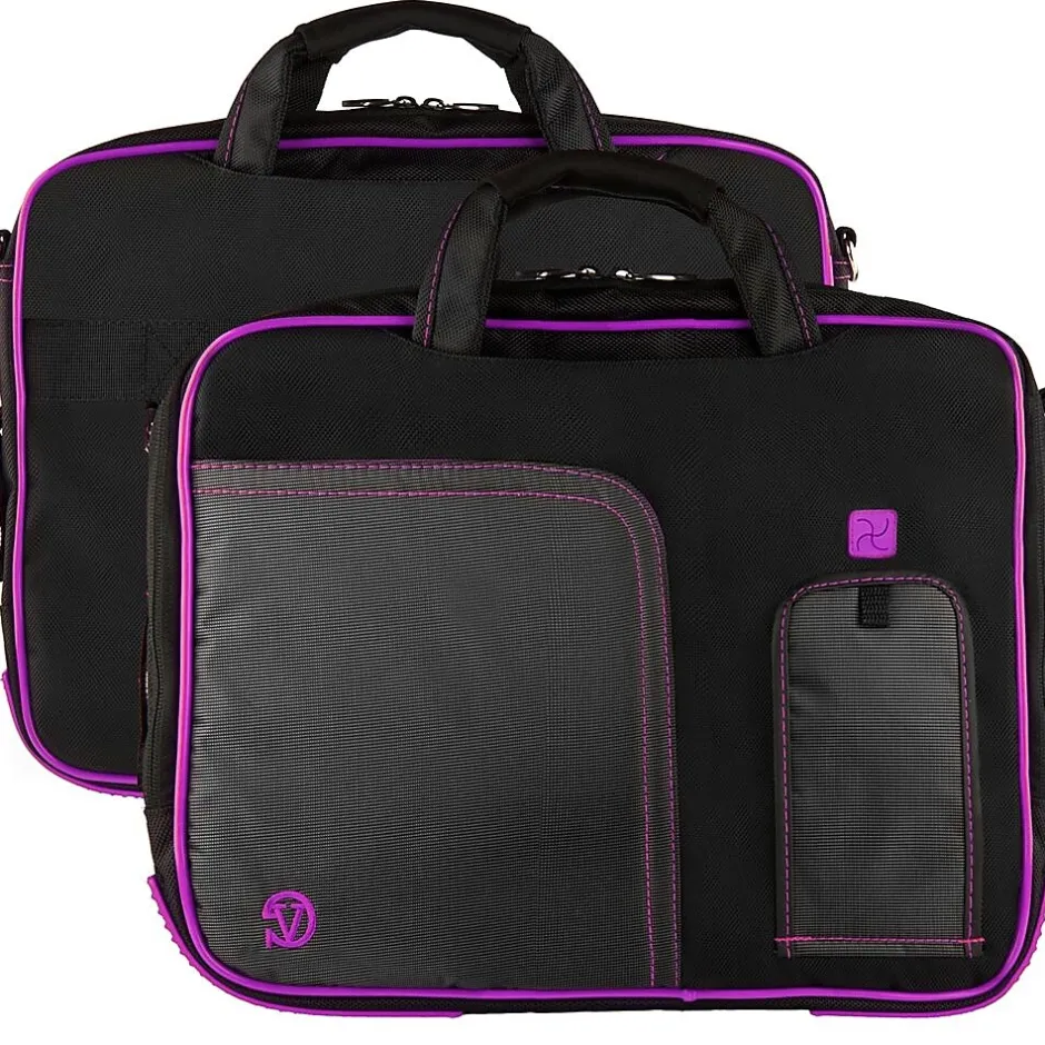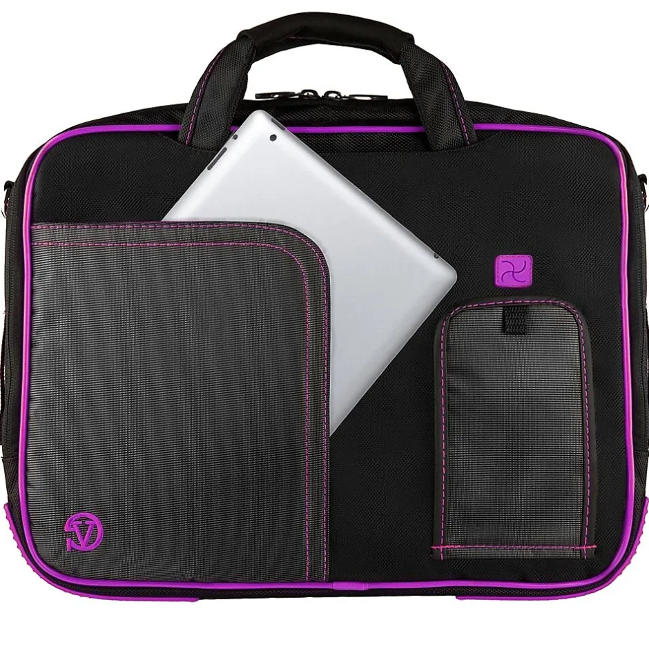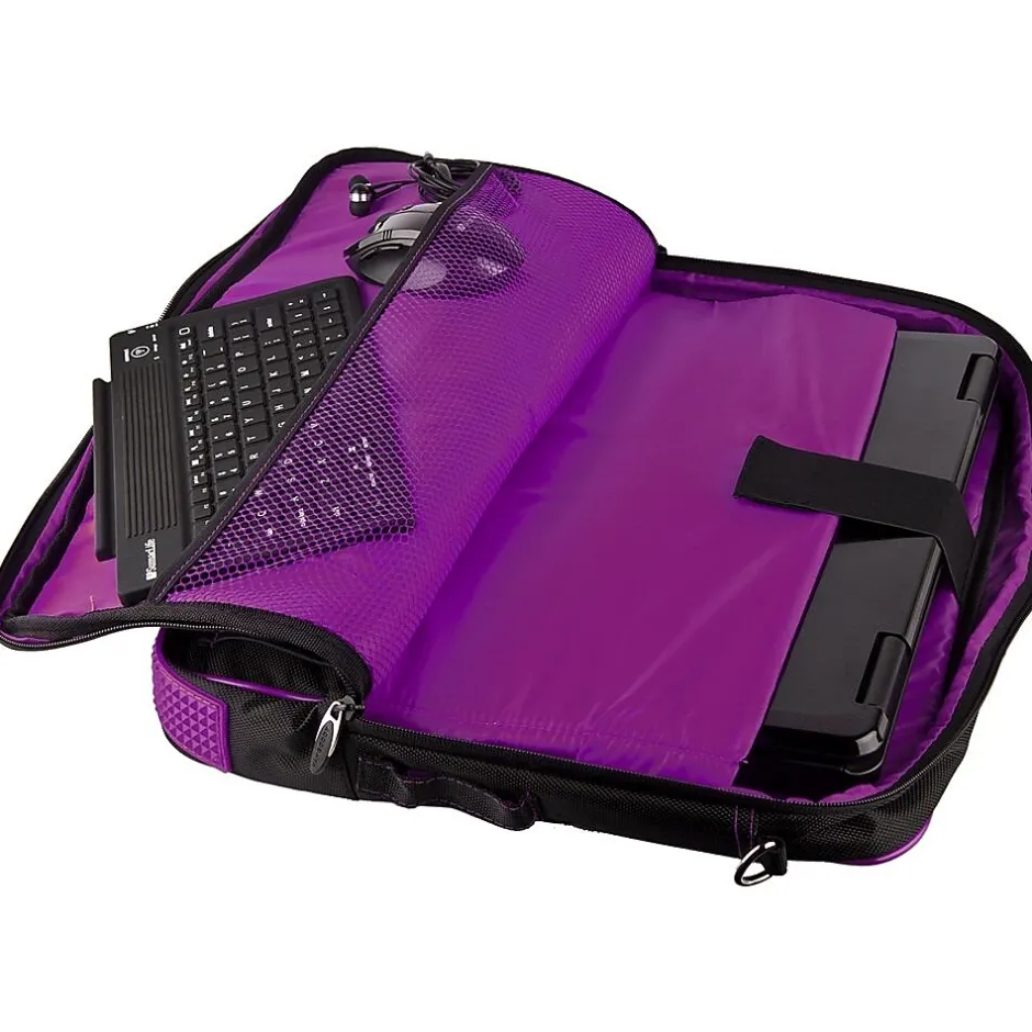 Carry and protect your laptop and accessories in style with this nylon carrying case. Features accessory pockets for business cards, pens, stylus, and tablets/eReaders up to 8.5in X 9.5in in size. This ultra lightweight and stylish laptop case is made with well-knit dual zippers. Compact laptop case with padded shoulder strap and handles that compact into the bag. Easily store phones or MP3 players up to 5.75in X 3.25in in size and text, change songs, view and reply to emails etc. all without removing device from the case! The see through covering does not interfere with touch screen capabilities! Both sides of the bag have a closeable slot so your device can remain in the bag while charging. External Dimensions 17 x 2 1/2 x 14”.