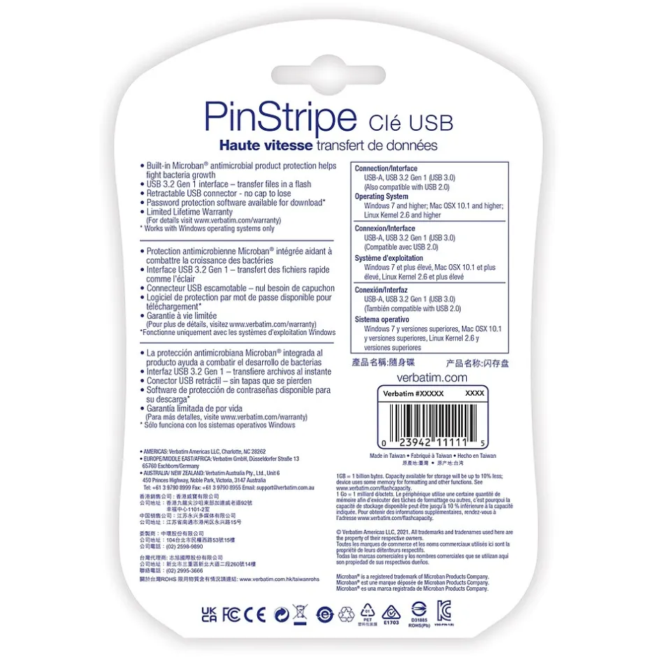 With USB ports in almost every computer and popping up in cars, DVD and multimedia players, TVs, photo frames and more, USB drives are an essential accessory for storing and exchanging digital content. The Verbatim PinStripe USB 3.2 Gen 1 drive has a push-and-pull sliding feature, which protects the USB connection when not in use. These Verbatim USB drives include built-in Microban antimicrobial product protection. This antimicrobial technology helps prevent the growth of bacteria – keeping your USB drives clean