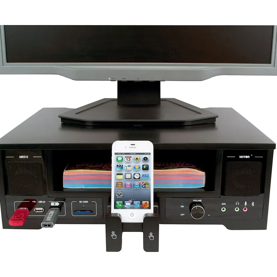 Bluetooth connectivity plays music from all supported devices on the two high quality speakers. There are 4 high speed USB 2.0 ports, which allow you to connect and power any USB device, including flash drives. The iPhone / cell phone holder slides out to keep most mobile and tablet devices close at hand. The open shelf is perfect for storing loose papers or folders. The hand-finished matte black surface completes the overall look for the All In One monitor stand.