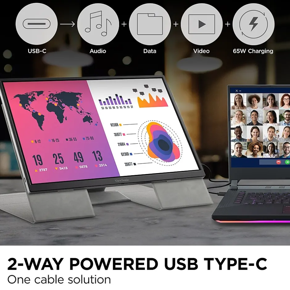VG1656-2K is a portable 16” 16:10 monitor designed for optimal productivity on the go. Weighting less than 2lbs and under 0.5” thick, with an intuitive smart cover to both provide versatile viewing options and protects the screen in transit, this portable is optimized to take on the road. A WQXGA 2K resolution offers vivid details for crispy and clear imagery. The two way power USB-C connectors provide a one-cable solution for multimedia transfer and 65W power charging, either receiving power from a laptop or power bank, or being able to pass through power to the connected device, when the portable is connected to a power source.