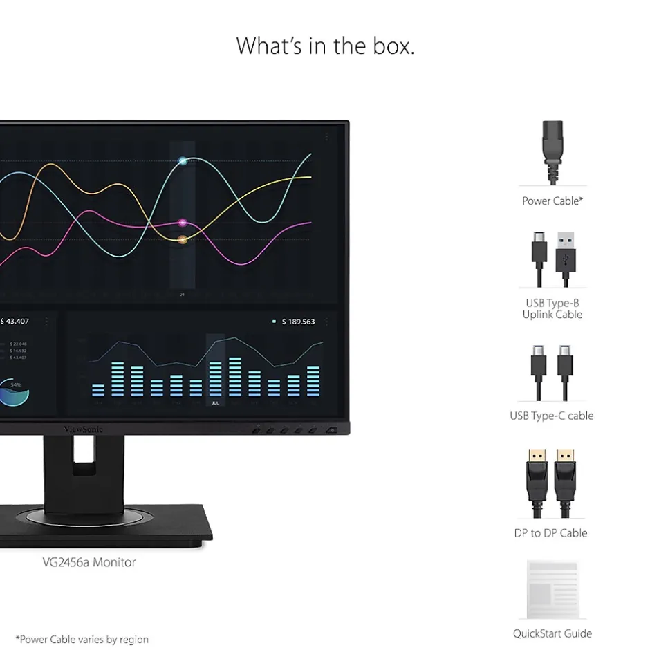 Designed to boost productivity and maximize output, the ViewSonic VG2456a is a 24-Inch docking monitor that transforms your desktop into a streamlined and efficient workspace. Enjoy reliable and flexible network connectivity with the integrated gigabit Ethernet port, while the latest USB 3.2 Type-C connectivity makes dual-monitor setup a breeze and provides up to 90W power delivery to your laptop. That’s not all, the integrated USB hub also provides single-cable simplicity for connecting and charging your peripherals and accessories. A best-in-class ergonomic design features 40-degree tilt and bi-directional pivot so your screen and workspace are as comfortable as you need. In addition, the included vDisplay software gives you quick and easy OSD control, as well as customized screen templates for easy multi-tasking. This monitor is also shipped in eco-friendly biodegradable packaging, along with an easy-to-install quick release stand that makes for quick deployment and a lower total cost of ownership.