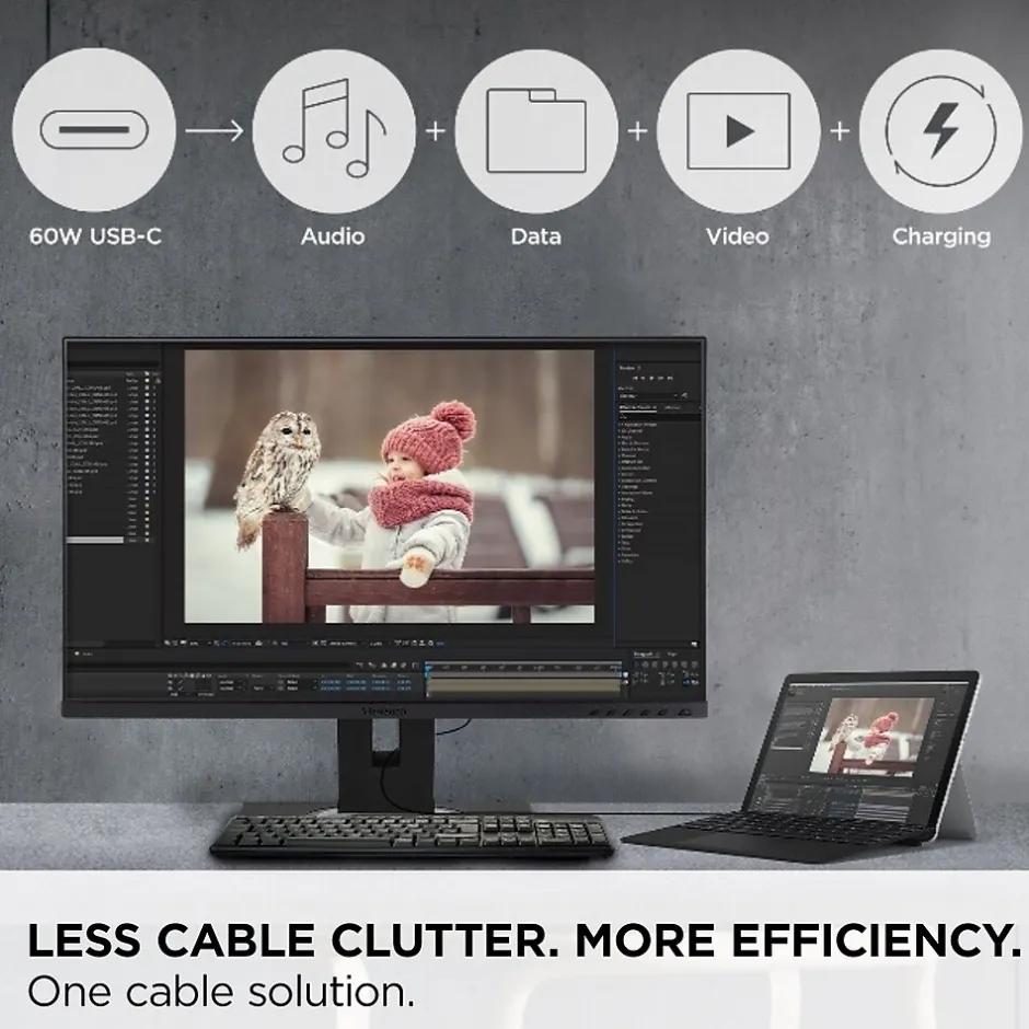 Designed for Surface (DfS) products must meet the rigorous standards of Microsoft to ensure optimal compatibility with Microsoft Surface products. The ViewSonic VG245 monitor is compatible with all USB Type-C Surface devices and is perfect for office and home use. USB Type-C connectivity offers convenient charging power, video, and audio over a single cable, and will charge your Surface device without the need for an additional power cable. Along with USB Type-C, additional connectivity options include HDMI, DisplayPort, VGA, and a USB hub. This 24″ monitor also includes an advanced ergonomic design that features height adjustment, pivot, swivel, and tilt for maximum comfort and enhanced productivity. The quick-release stand also includes an integrated client mount and cable management features.