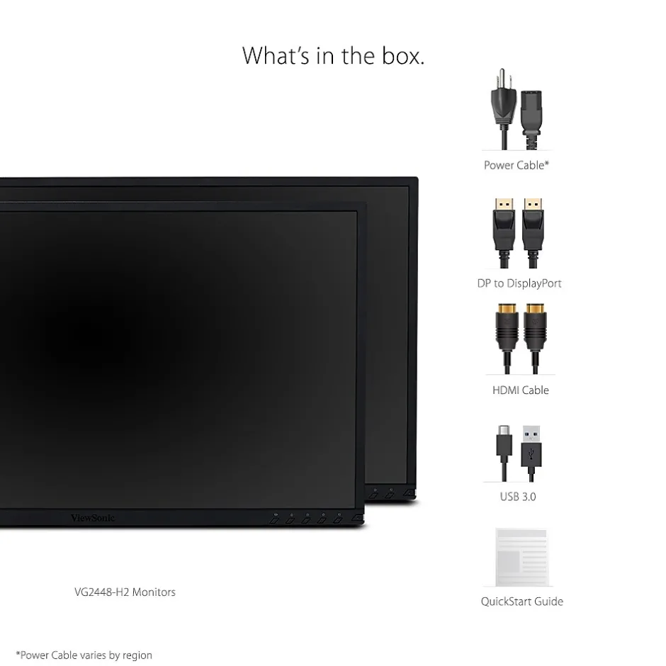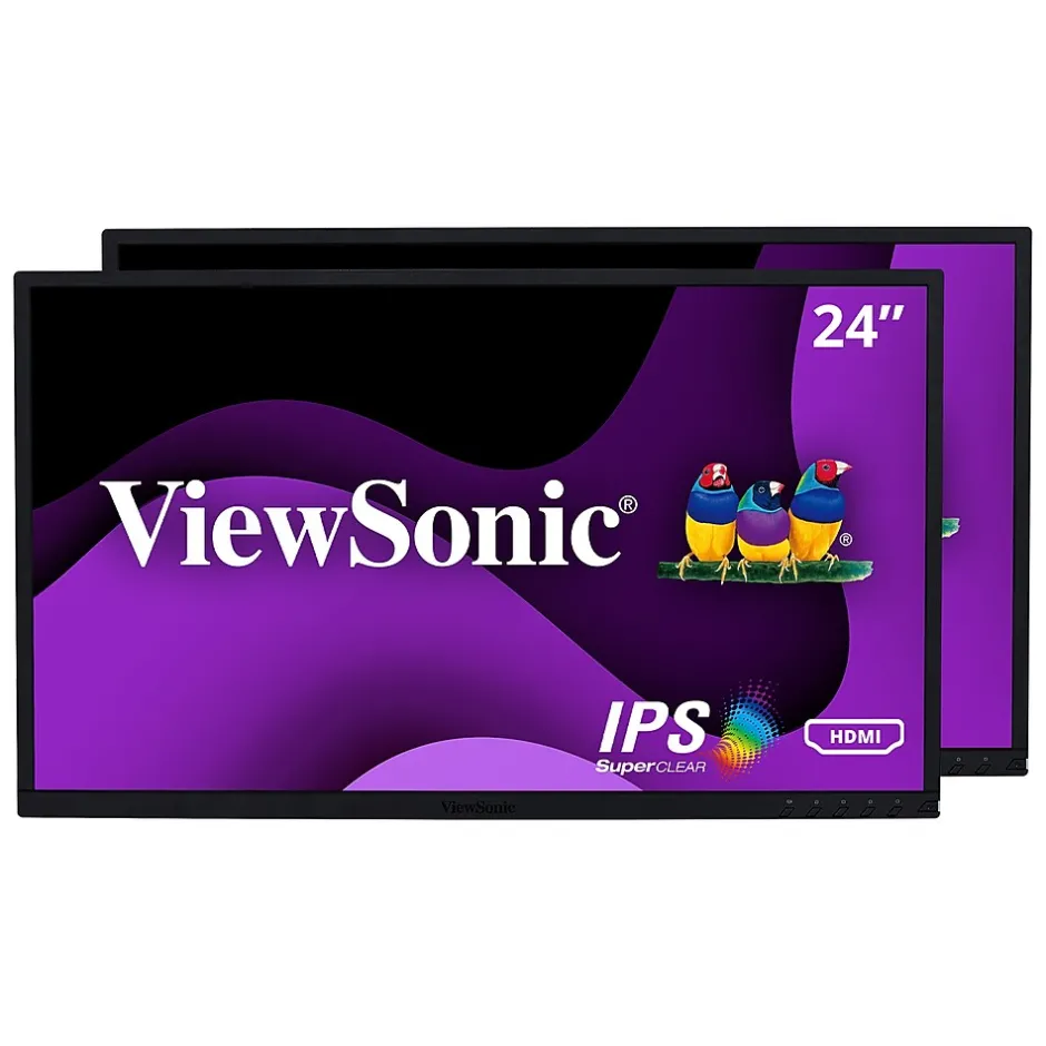Designed for the modern day office, the ViewSonic VG2448_H2 dual monitor pack delivers an efficient end-to-end enterprise experience. From easy installation, to recycling, to long-term reliability, this dual monitor solution reduces the total cost of ownership beyond the initial purchase price. Sold as a dual pack of monitors without monitor stands, the VG2448_H2 ships in biodegradable packaging to minimize recycling costs and waste. Standard VESA-compatible mounting offers easy dual-screen installation. SuperClear IPS panel technology delivers wide-angle viewing and incredibly vivid colors. A variety of input options include VGA, HDMI, DisplayPort and USB 3.0 to deliver both legacy and future-proof connectivity.