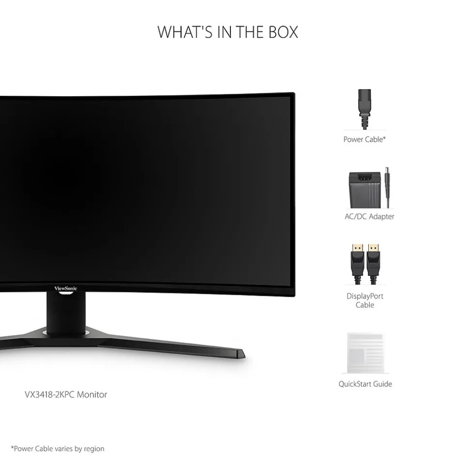 With an immersive 1500R curved screen and stunning WQHD 3440 x 1440 resolution, the ViewSonic VX3418-2KPC monitor provides an incredible viewing experience for work or play. With features including a high 144Hz* refresh rate, 1ms (MPRT) response time and adaptive sync technology, this monitor virtually eliminates screen tearing and stuttering for a fluid gaming experience. The VX3418-2KPC also comes equipped with ViewSonic exclusive ViewMode presets, which offer optimized screen performance for different home entertainment applications such as watching movies, editing files, or playing video games. Two HDMI (v2.0) inputs, and one DisplayPort (v1.2) input offers flexible connectivity for both general use and entertainment.