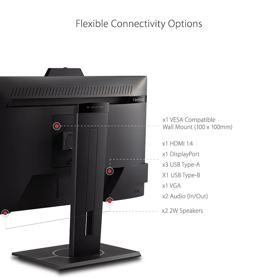 Featuring a built-in 2MP camera, the ViewSonic VG2440V monitor is perfect for collaboration and video conferencing right from your desktop. The integrated camera captures high-definition video and features 5-degree adjustability so you can find the perfect angle for your video conference. The camera also features a privacy shutter that ensures the camera is on only when you want it to be on. An integrated microphone and speakers round out the full video conferencing capabilities of this monitor. The 24-Inch (23.8-Inch viewable) monitor itself features a Full HD SuperClear IPS panel for vivid visuals, and a full ergonomic stand for comfort and productivity. Integrated HDMI, DisplayPort and VGA ports make it easy to connect whether you are set up at home or at the office.