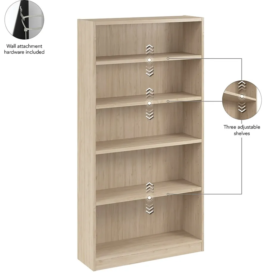 The Bush Business Furniture Vista Tall 5 Shelf Bookcase keeps any office or workspace organized and clutter-free, adding a modern touch and extra storage where it’s needed. Three adjustable shelves move up and down while two fixed shelves offer added stability and provide extra storage. The sturdy 1-inch thick shelves have a weight capacity of 50 pounds each, so storing paperback and hardcover books, vinyl records, DVDs or video games is never a problem. Wall attachment hardware is included for family-friendly safety and security in a home office or living room. Available in your choice of contemporary finishes. This tall 5 tier bookshelf has been meticulously tested to meet or exceed ANSI/BIFMA quality standards for safety and performance and is backed by the Bush Furniture 10 Year Manufacturer’s Warranty.