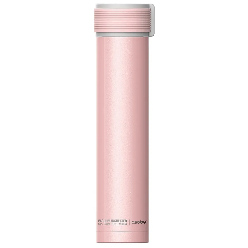 This fashion-forward Pink ASOBU 8 Oz. Skinny Mini Ultimate Lady Flask is the ideal bottle to carry for on the go! This bottle keeps liquids cold up to 12 hours and hot up to 4 hours. The silicone top band flips over and can be used as a carry strap. The Skinny Mini is a great, fun way to keep water (or other drinkables) with you no matter where you go.