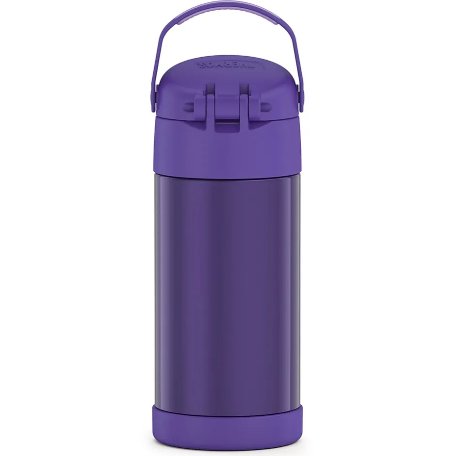 The Thermos 12 Oz. FUNtainer Stainless Steel Bottle keeps drinks cold for up to 12 hours. The double wall stainless steel construction is built to handle drops, dings and assorted roughhousing. Featuring a hygienic, push-button lid, this bottle is easy to open and drink from. To clean, you can pop your Purple FUNtainer Bottle in the dishwasher; however washing by hand is recommended.