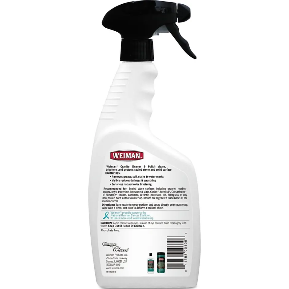 Granite cleaner and polish safely removes grease, grime and surface stains while visibly reducing surface scratches. When used regularly, it cleans, brightens and shines granite, marble and many other stone surfaces. It reverses dullness to reveal natural colors and veining. Removes grease, soil, stains and watermarks. Works to enhance the natural color and beauty of the stone. Its versatility and effectiveness make it a must-have cleaning essential.