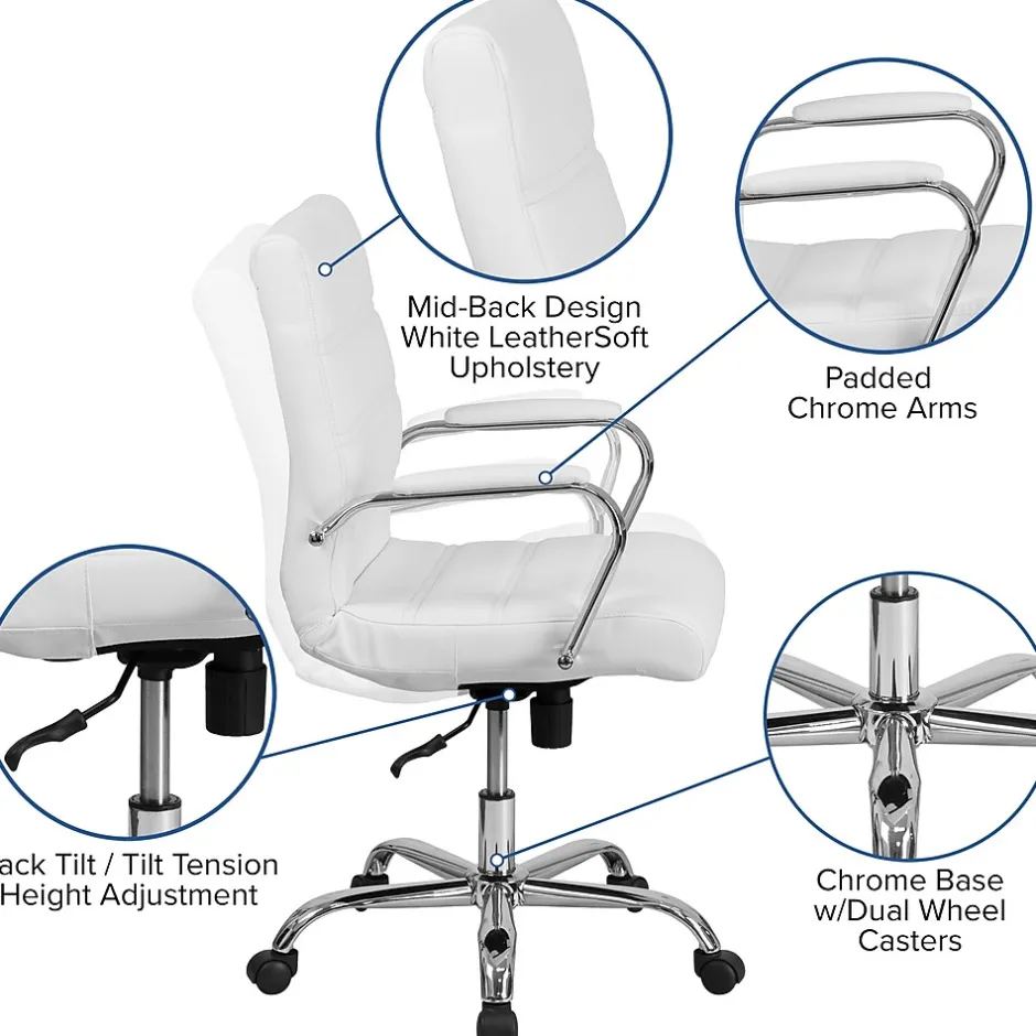 Toss out that old and boring office chair that you’ve had for years because it’s time for an upgrade with this sleek mid-back LeatherSoft office chair. Upholstered in soft and durable LeatherSoft upholstery and paired with chrome finishing help construct this modern office chair. Designed with your comfort in mind, this ergonomic desk chair features ample padding to get you through an 8-hour workday. With its adjustable features, you can lean back while you take a quick phone call or lock in an upright position when it’s time to focus. The knob located underneath the seat adjusts the force needed to recline. Improve the look at your desk or work area with this stylish Mid-Back White LeatherSoft Office Chair with Chrome Base that is highlighted by attractive horizontal line stitching. A pressure reducing waterfall front edge seat and armrest pads round out the look and comfort of this chair.