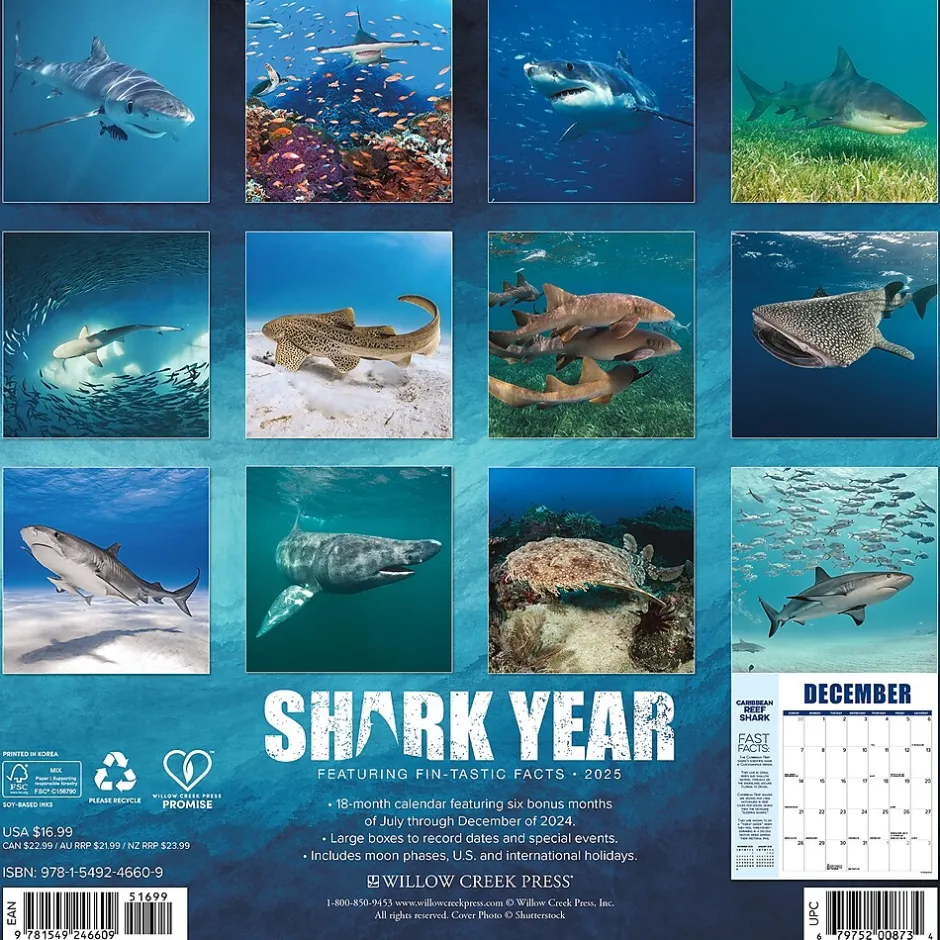 - THE PERFECT GIFT – Make a splash with shark enthusiasts, ocean lovers, and anyone captivated by the mysteries of the deep in the 2025 Shark Year 12″ x 12″ Wall Calendar. With their remarkable adaptations and behaviors, sharks have valuable lessons to teach us about resilience, adaptability, and persistence.