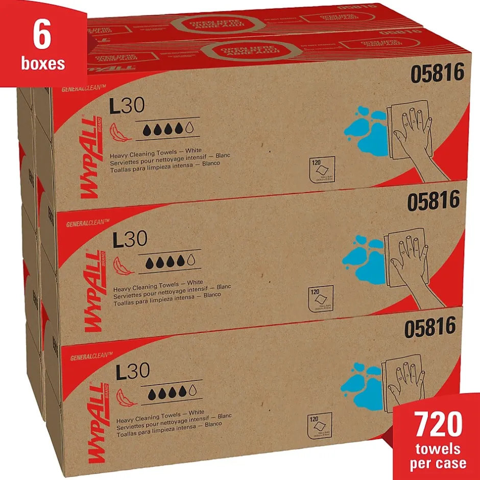 Keep these white wipers in stock to handle spills and other messes. Each cloth has a soft texture ideal for use on faces or hands, while the reinforced grid offers the durability required to handle heavy-duty tasks. These WypAll L30 wipers come in a box of 720 units, making them a great choice for large areas with frequent cleanup jobs.