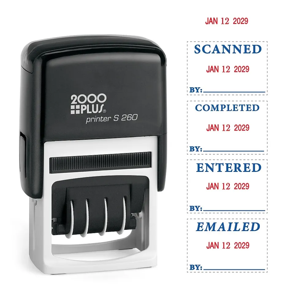 Self-inking message stamp features four interchangeable messages: Scanned, Emailed, Entered and Completed. Two-color pad for message and date. Ink colors: red and blue. Five-year date band. Perfect for office use.