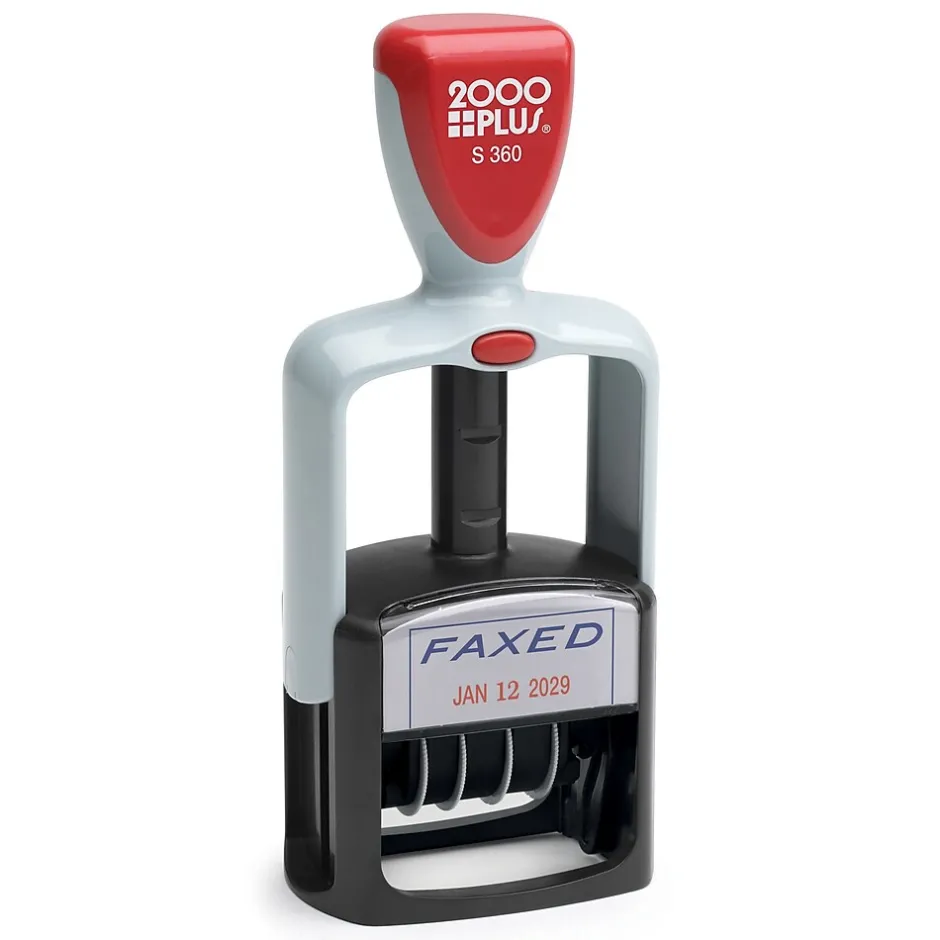 Keep track of faxed documents with this blue and red ink date and message stamp. This 2000 Plus stamp prints a label as well as the month, day and year by using an adjustable five-year date band.