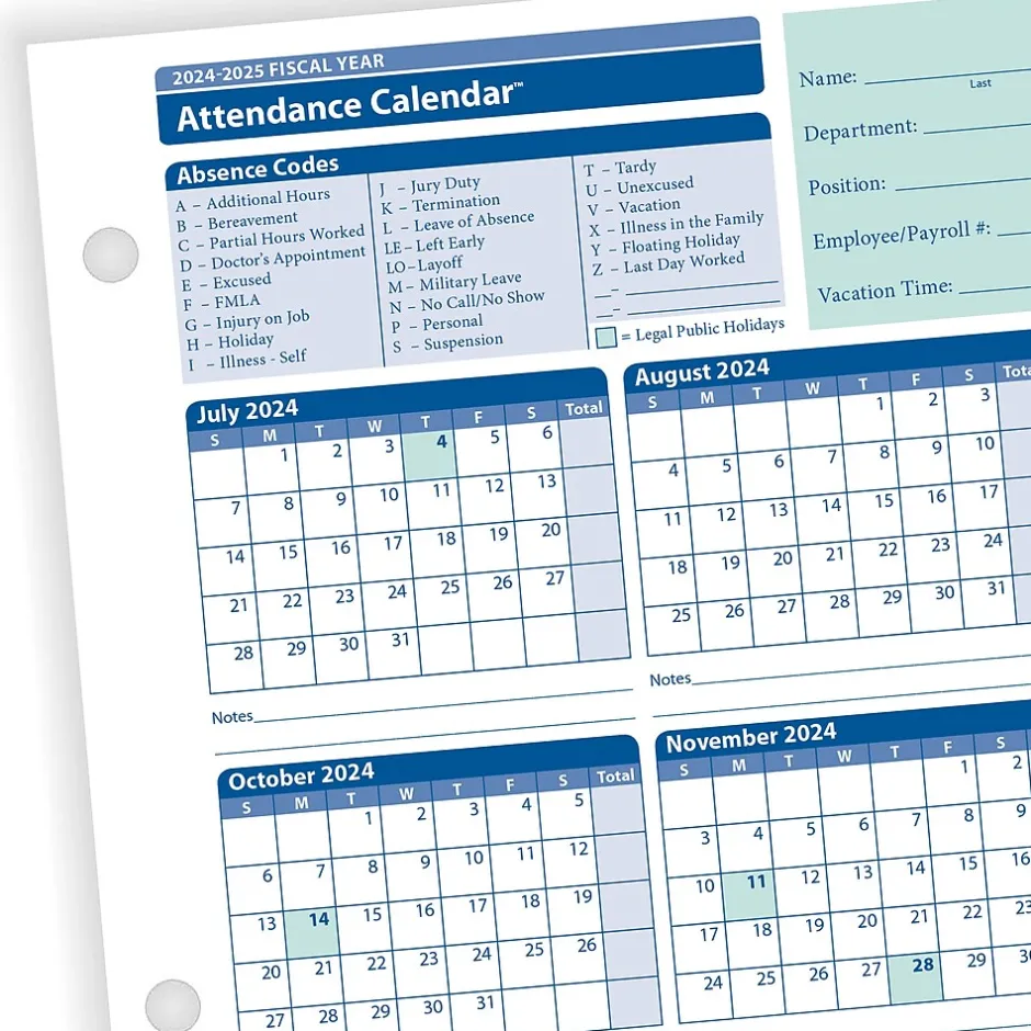 The efficient calendar format of the ComplyRight Fiscal Year Attendance Calendarâ„¢ (July 1 – June 30) and easy coding system make tracking absences quick and convenient. The card includes a special section for tracking sick time and accrued vacation days and provides key documentation for performance reviews, unemployment disputes and tracking leaves. The reverse side of the cards includes plenty of space to record notes and warnings. This pack of 50 includes ComplyRight tips for optimal, compliant use.