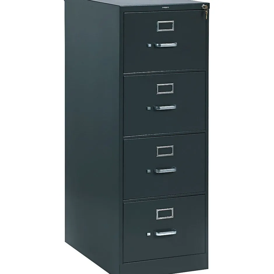 - Four-drawer vertical filing cabinet holds legal-size documents