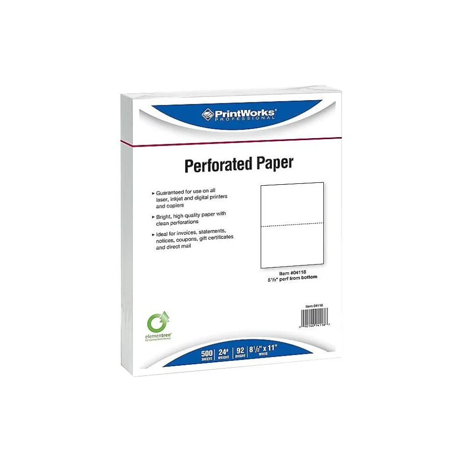 Help customers separate coupons, gift certificates, invoices and other notices cleanly and easily with this white perforated paper. With perforations 5.5 inches from the bottom of each sheet, this letter-size paper is perfect for horizontal designs that split in half. This PrintWorks Professional 24-pound perforated paper comes in a 2,500-sheet carton and is compatible with most laser, inkjet and digital printers and copiers, ensuring maximum versatility for projects at the office or at home.
