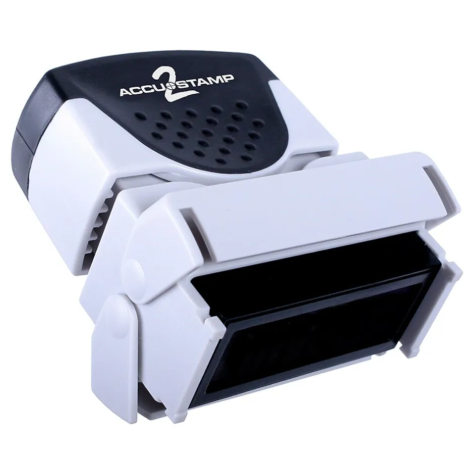 The Accu-Stamp 2 pre-inked one-color message stamp features an ergonomic grip and shutter dust cover that automatically opens and closes while stamping.