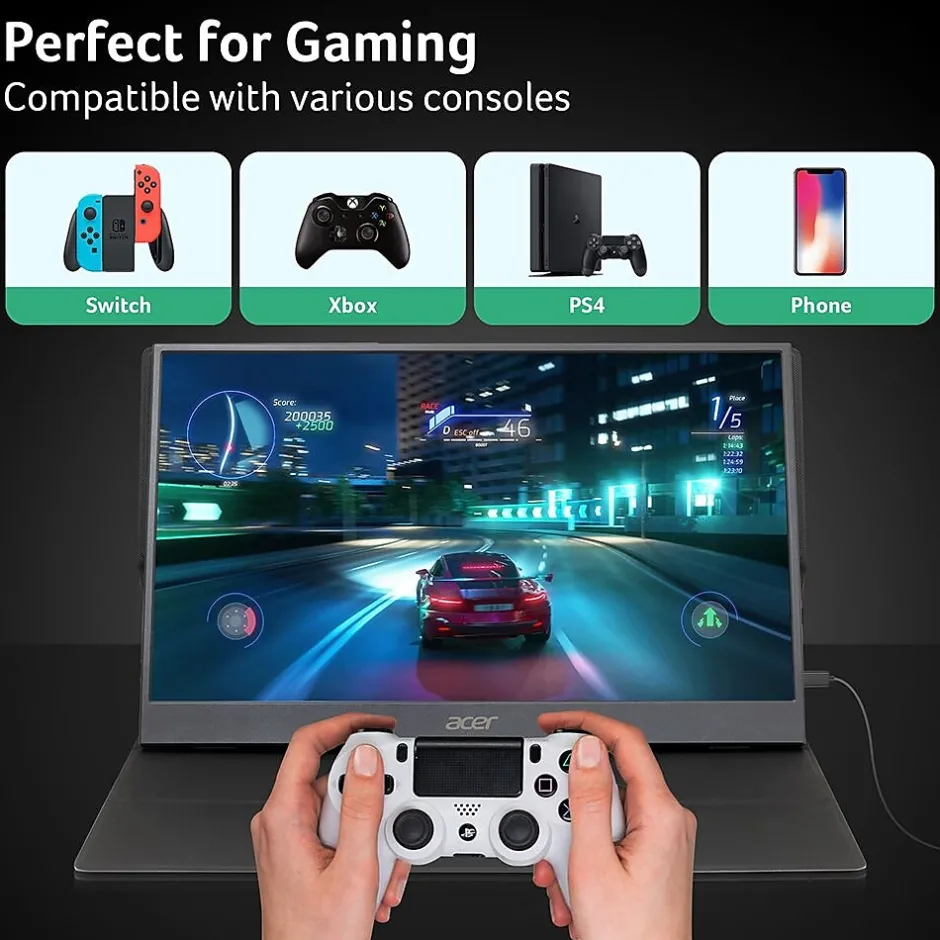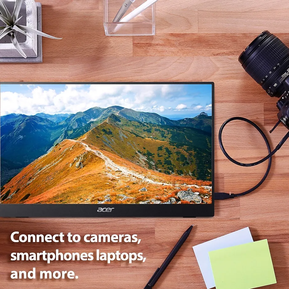 Increase your productivity on the road with the 15.6″ PM161QB Portable IPS Monitor from Acer. This monitor is equipped with a 60 Hz, 1920 x 1080 resolution display, making text appear clean and crisp, while a 4 ms response time keeps fast moving objects from blurring. Support for 16.7 million colors, a 1000:1 contrast ratio, and 250 nit brightness rating ensure vivid and accurate color.