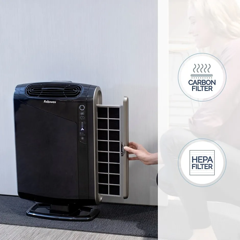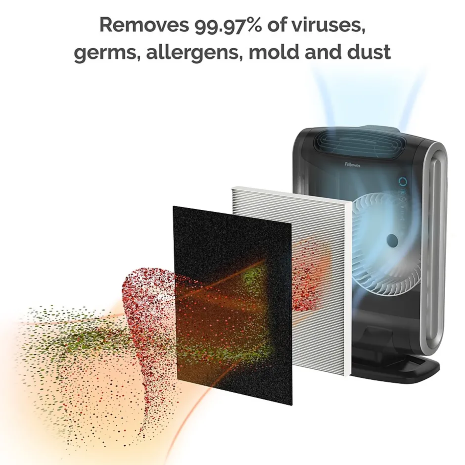 The Fellowes® AeraMax® 290 Air Purifier uses 4-stage hospital-type filtration to effectively purify air in large rooms 300 – 600 square feet. The AeraSmart™ Sensor monitors the air quality and automatically adjusts the fan speed to keep your air purifiedwith ultra-quiet operation. A True HEPA filter with AeraSafe™ antimicrobial treatment safely removes 99.97% of airborne particles as small as 0.3 microns. Backed by a 3-year manufacturer limited warranty.