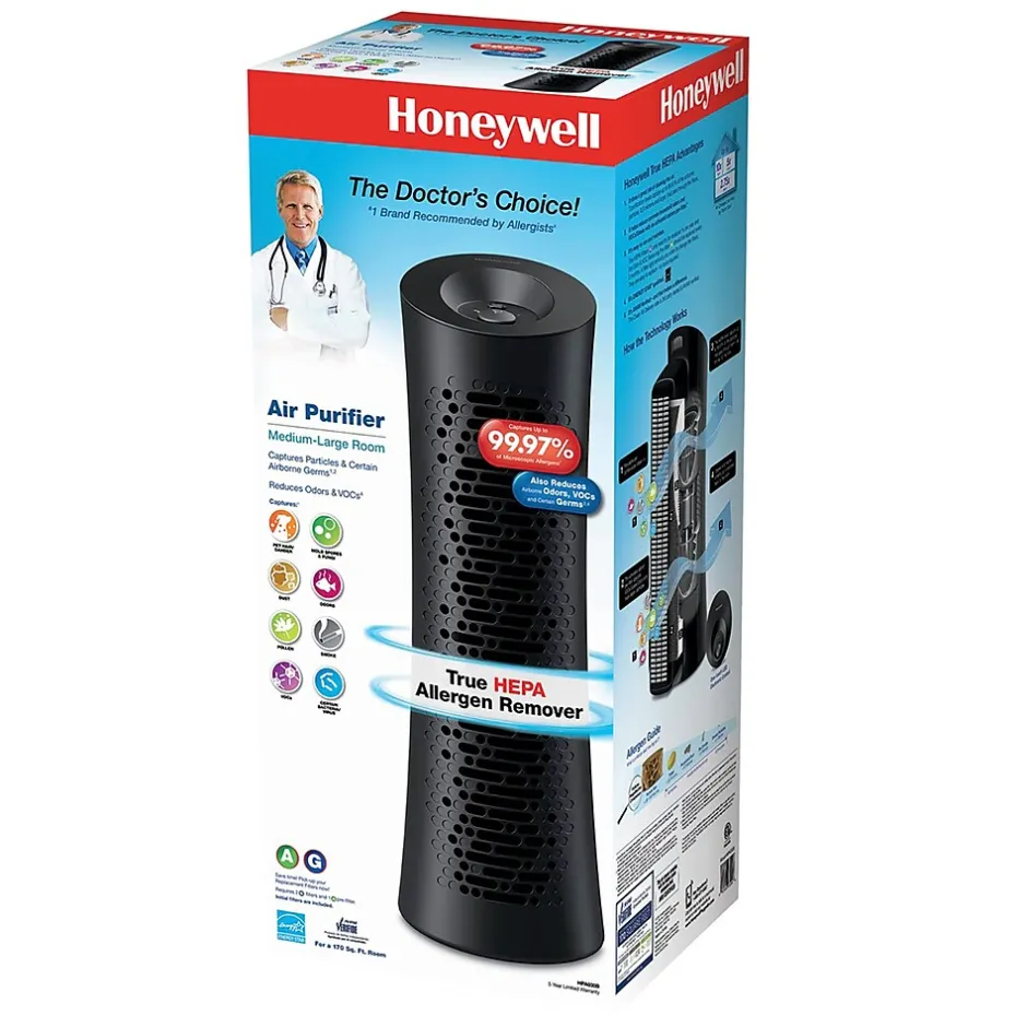 Our highly effective air purifiers capture 99.97% of the microscopic particles (0.3 microns and larger) that pass through their filters. Honeywell True HEPA air purifiers are efficient at capturing airborne pollutants like dust, pollen, pet dander, mold spores, and tobacco, cooking and fireplace smoke particles. This model also captures certain bacteria and virus from the air passing through the filters. With a slim design and easy-to-use controls, this air purifier uses a mechanical filtration process – meaning that a fan pulls the particle-filled air into the unit and forces that air through a HEPA filter, effectively cleaning and circulating the air in the room up to 5 times an hour. And, Honeywell True HEPA Air Purifiers do not release ozone back into the air from the filtration process, making them the preferred option of Allergists.***