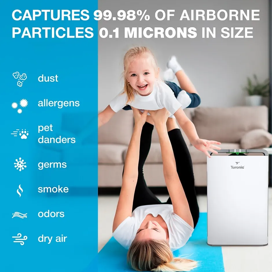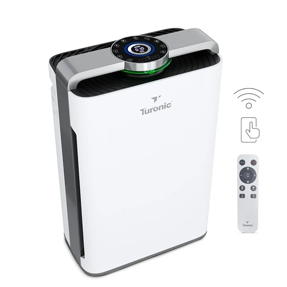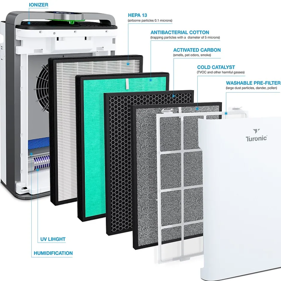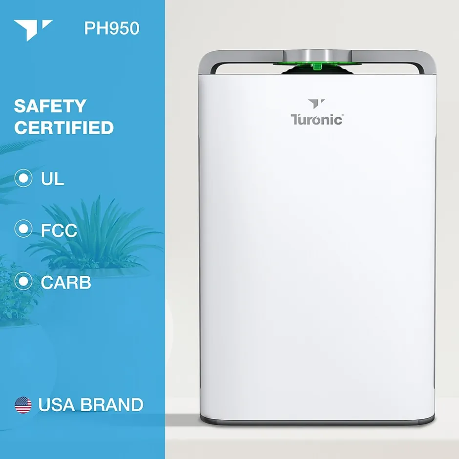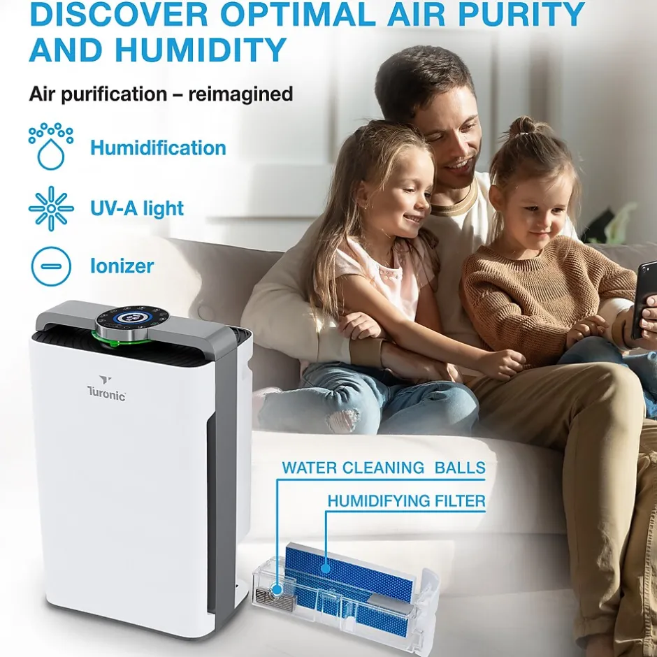 Create a clean and fresh atmosphere in any large room with a PH950 HEPA air purifier for home. Powerful air purifier to cleanse up to 2500 sq ft/2 h, 1875 sq ft/1.5 h, and 1250 sq ft/h.Capture pet dander, smoke, dust, odors, and allergens from your place. PH950 is built with a mesh prefilter, cotton filter, true HEPA filter air purifier, activated carbon and cold catalyst filter, as well as a humidifier, UV-A light, and air ionizer.Find the optimal level of humidity with a humidifier air purifier combo. Complete with water-cleaning balls for rich moisture.Switch to an 8-speed auto mode for seamless air refining at a low from 36 dB. Contains an ambient light sensor for silence in darkness.Control the smart air cleaner through a built with a touch panel, wi-fi app or remote. Includes a 12-h timer, filter health indicator, air quality display, and child lock.