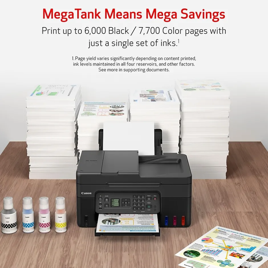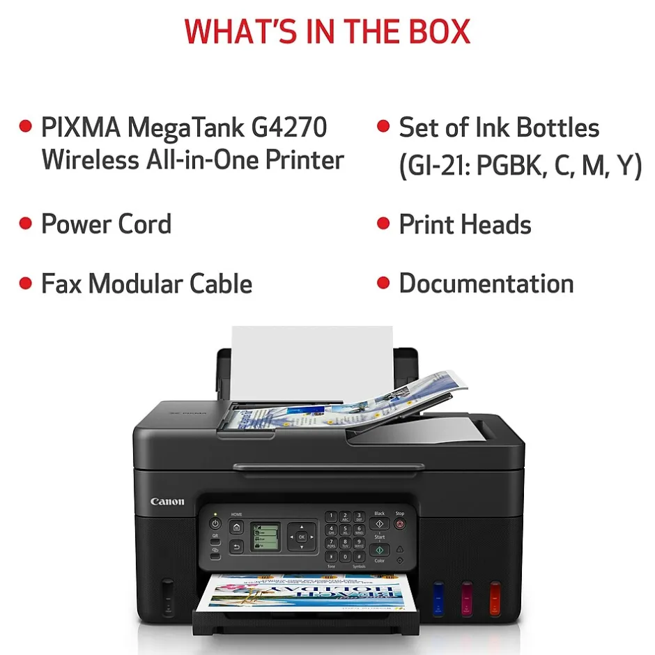 Designed for home and home offices, the Canon PIXMA G4270 MegaTank all-in-one inkjet printer delivers high-quality, low-cost printing, and outstanding wireless connectivity in a compact size. Get serious print productivity with a high page yield of up to 6000 black/7700 color pages per full ink bottle set and a low cost per print: MegaTank means mega savings. The PIXMA G4270 comes with a full set of ink, so you can print with confidence. The PIXMA G4270 is easy to set up and maintain and offers great media versatility to print on a variety of media types and sizes, including photo paper, envelopes, banners, and more. Use Poster Artist Online to create professional posters, banners, and signage. With built-in Wi-Fi and mobile-printing solutions such as AirPrint, Mopria, Canon PRINT app, Pixma Cloud Link, and Easy-PhotoPrint Editor app, you can print both documents and photos on a variety of paper types.