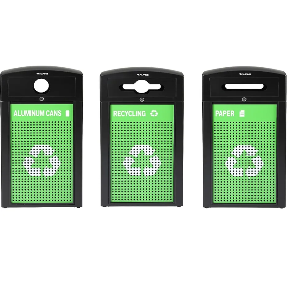 - 3-Stream recycling station includes three 40-gallon bins with slot opening, mixed slot, and circular openings to separate different kinds of recycling