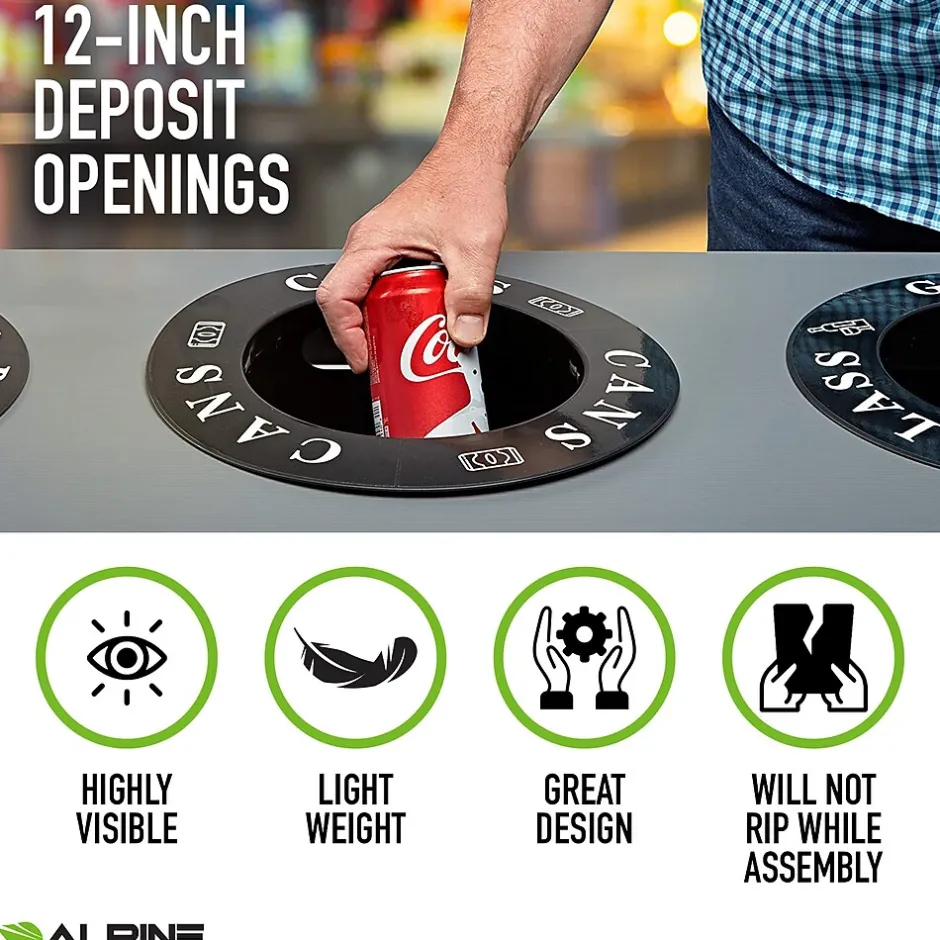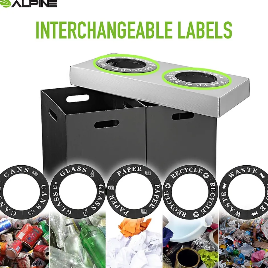 If you are looking for an attractive alternative to exposed garbage bags and other unsightly means of sorting trash from recyclables, the Alpine Industries waste and recycling bins are just the ticket. Lightweight, easily assembled and made of strong and durable corrugated plastic. Designed for indoor use in hospitality suites, meeting areas, dinners and similar venues, they perform best when bins are used as containers for disposable trash bags. Labels included for glass, plastic, paper, recyclables, cans and waste for 12 in. deposit openings. Set of 2.