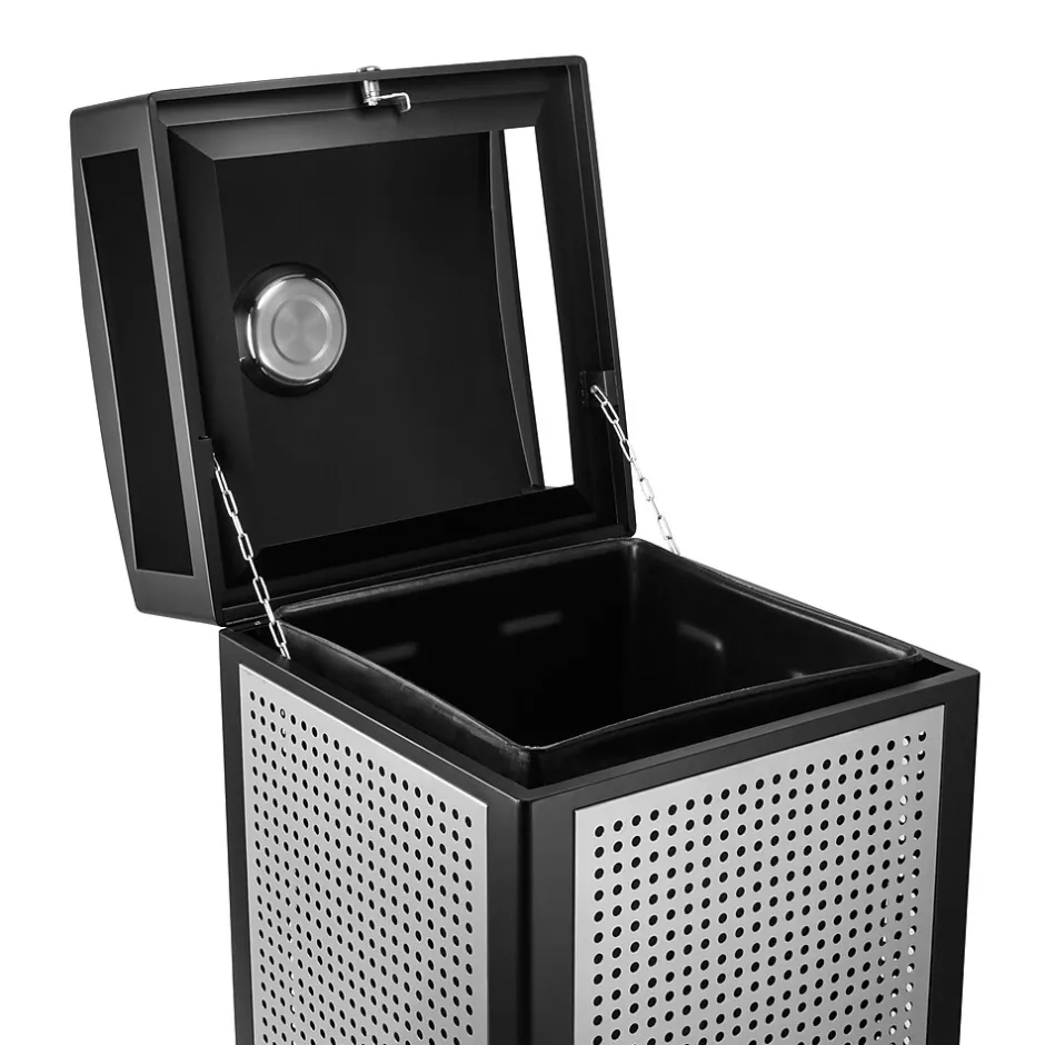 - This outdoor trash can is furnished in perforated, galvanized steel to meet your needs and accommodate your taste