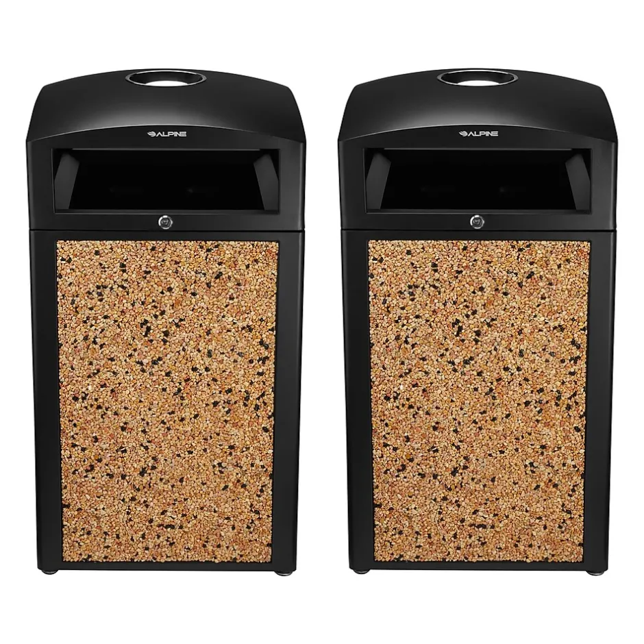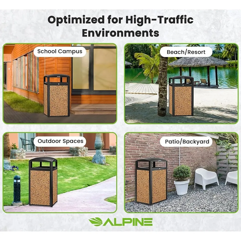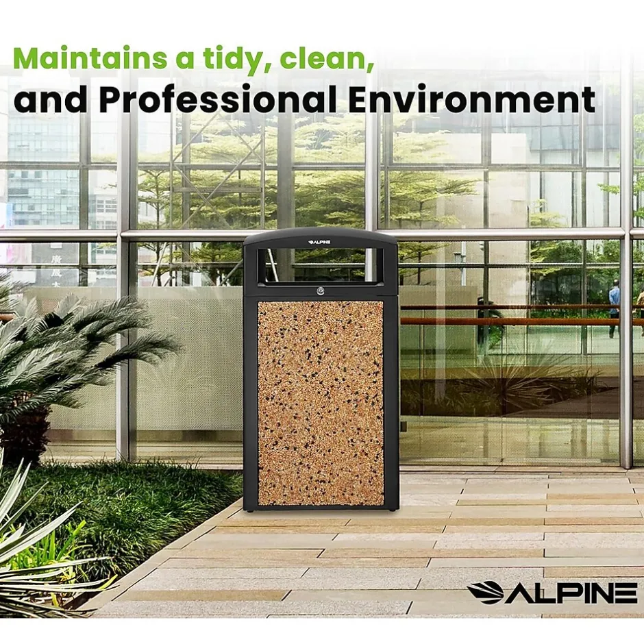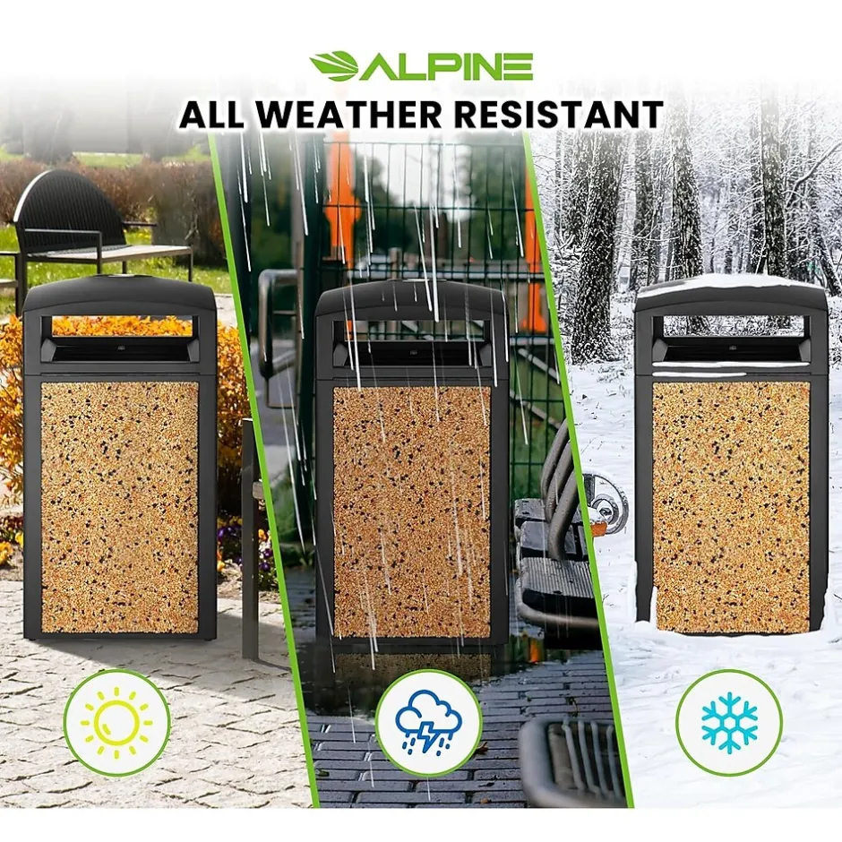 The Alpine Industries 40 Gal. Stone Panel All-Weather Outdoor Commercial Trash Can is the perfect solution to keeping your high traffic areas tidy at picnic grounds, food courts, ballparks, outdoor dining areas – any indoor or outdoor venue where food or beverages are served. Water-shedding, domed, lockable lid has generous openings on all 4 sides to receive refuse from any direction. Equipped with a piano hinge and dual chain retainers for secure support, the lid opens wide, giving easy access to quickly remove and replace trash bags from the separate, leak-proof, washable liner. Made from heavy-duty steel and genuine stone decorative panels. Built in stainless steel ashtray for extinguishing butts before disposal.