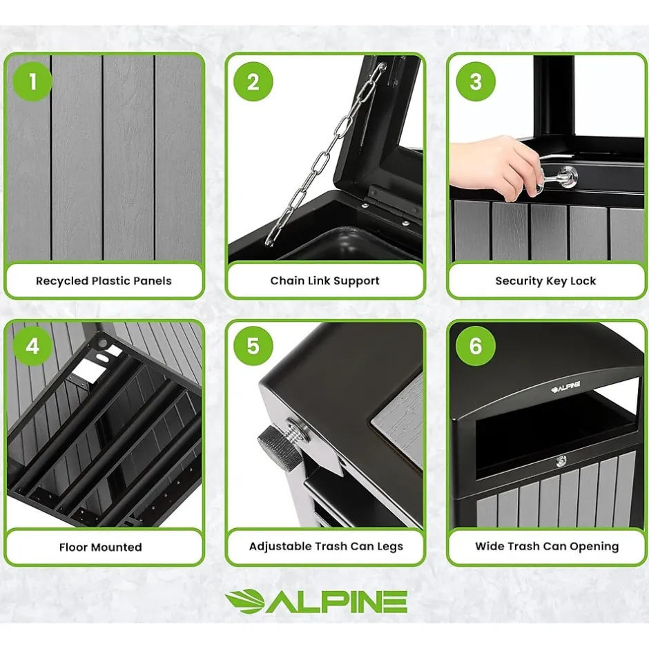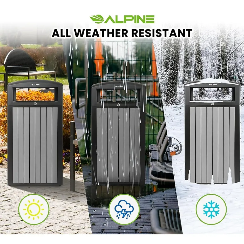 With this Alpine 40 gal. outdoor trash container, you can be confident you’re getting the most bang for your buck on a long-lasting product. Its weather-resistant powder-coated steel frame and lid will ensure its longevity while maintaining its quality. With an appealing exterior, this trash container consists of recycled plastic slats that add a warm and natural aesthetic to its surroundings. Additionally, its solid dome lid allows for rain to glide off easily and not pool, decreasing the likelihood of corrosion. The included heavy-duty plastic interior bin will securely hold trash bags without the worry of leaks. It’s a no-brainer to outfit your facilities with this superior trash container with all these fantastic features.