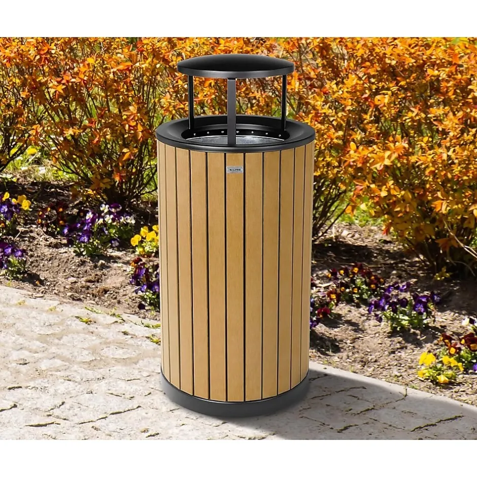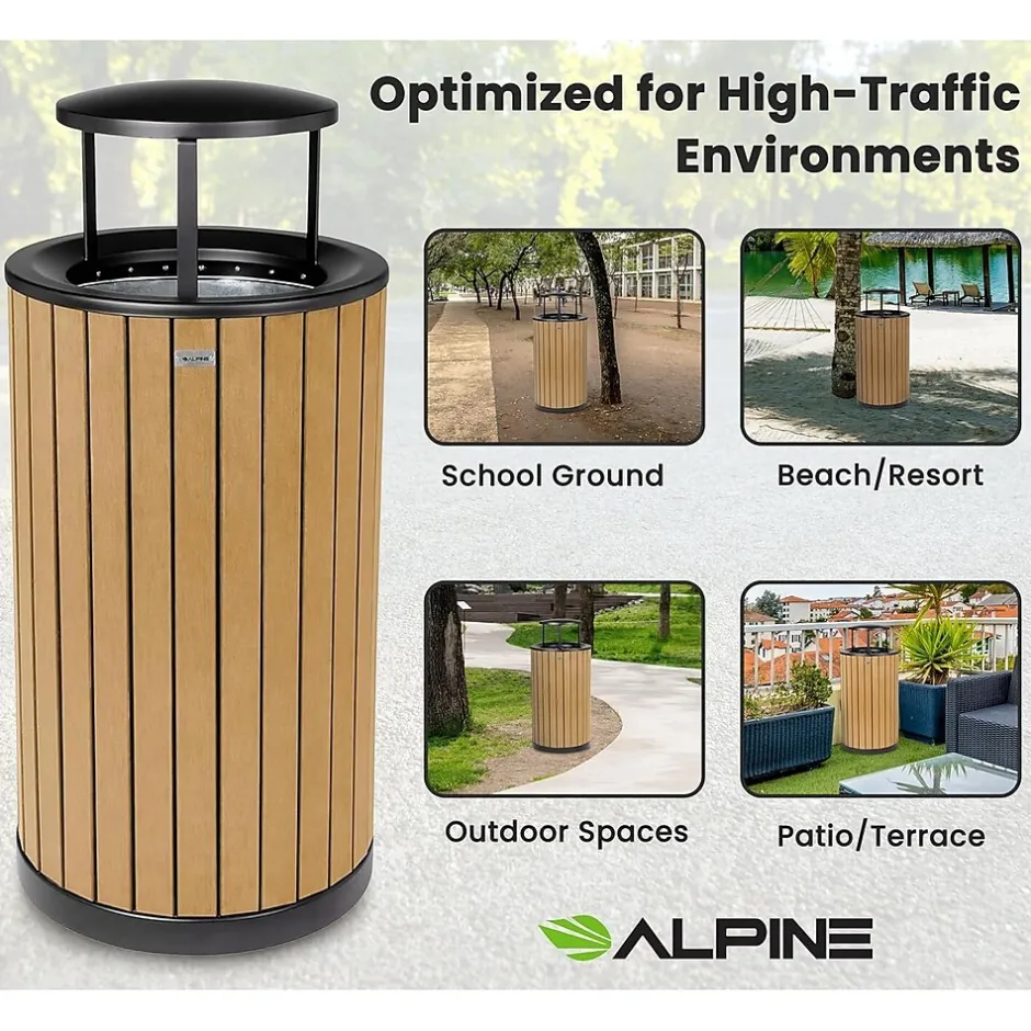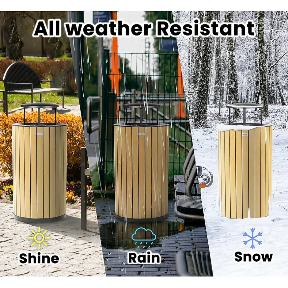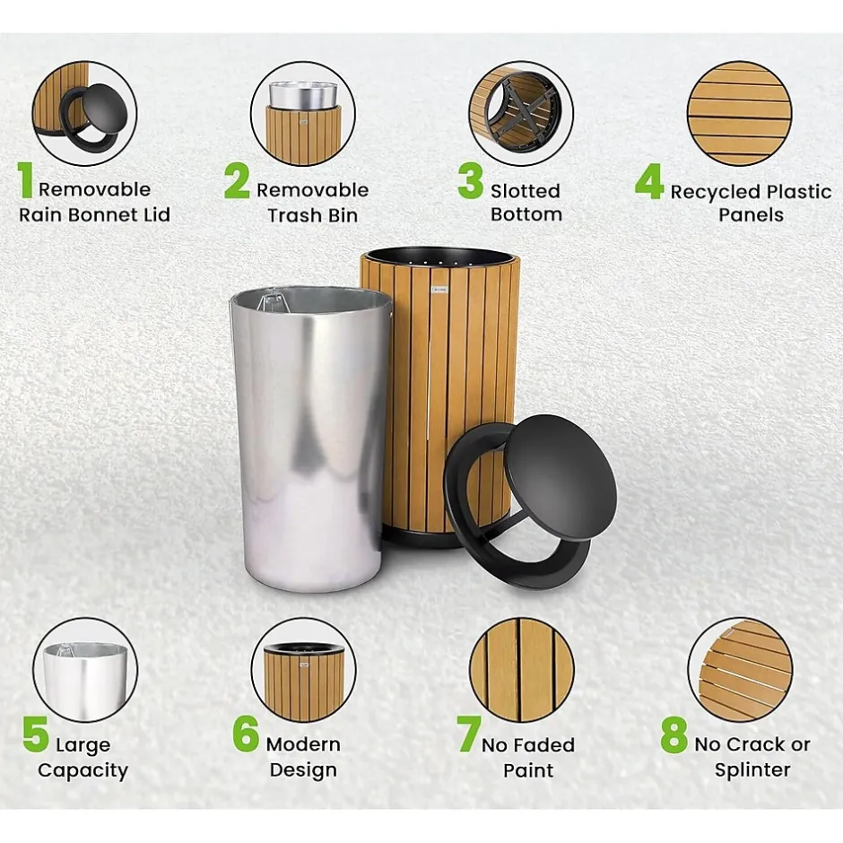 - The outdoor trash can features a recycled plastic cedar exterior that adds an earthy and a natural aesthetic, allowing it to blend seamlessly into its outdoor environment