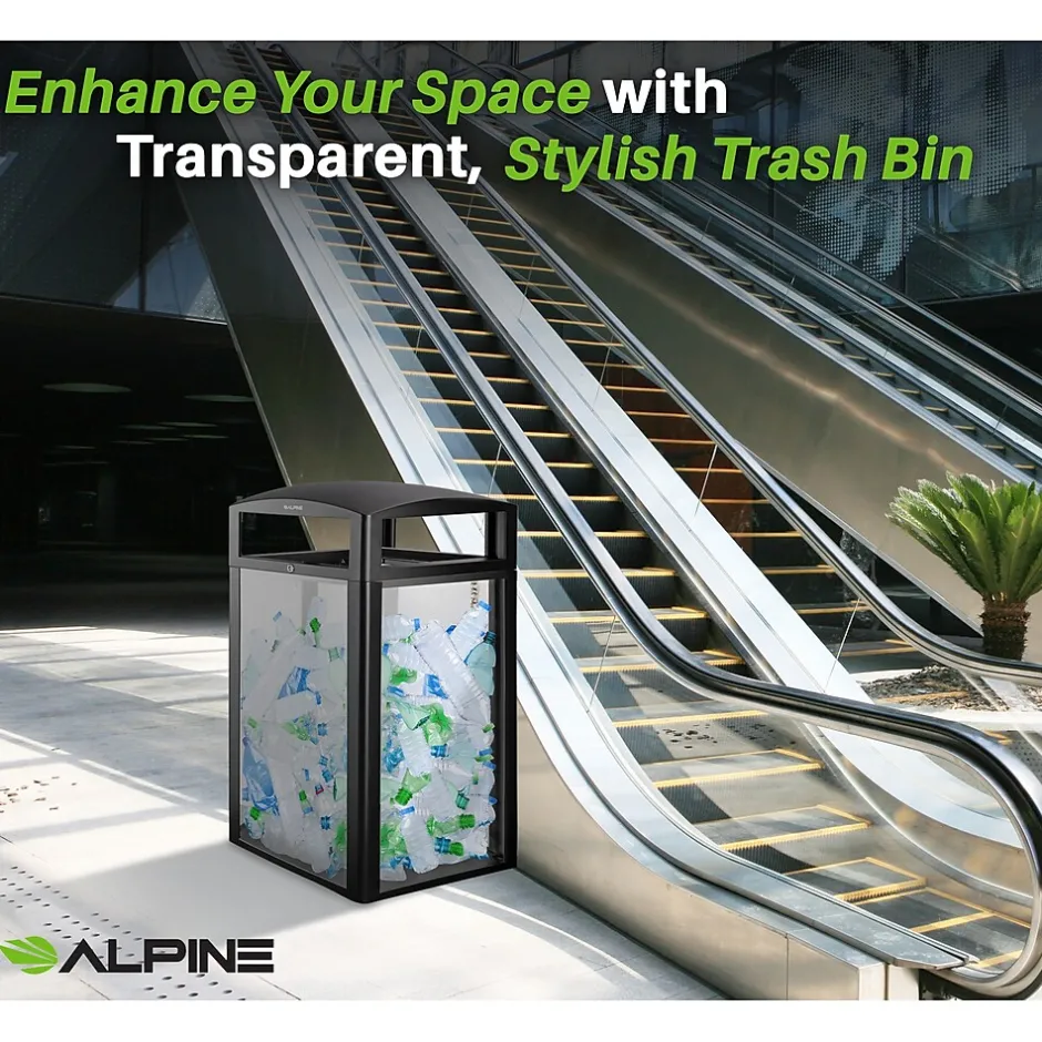 - The outdoor trash can is designed with a steel frame and polycarbonate see-through panels