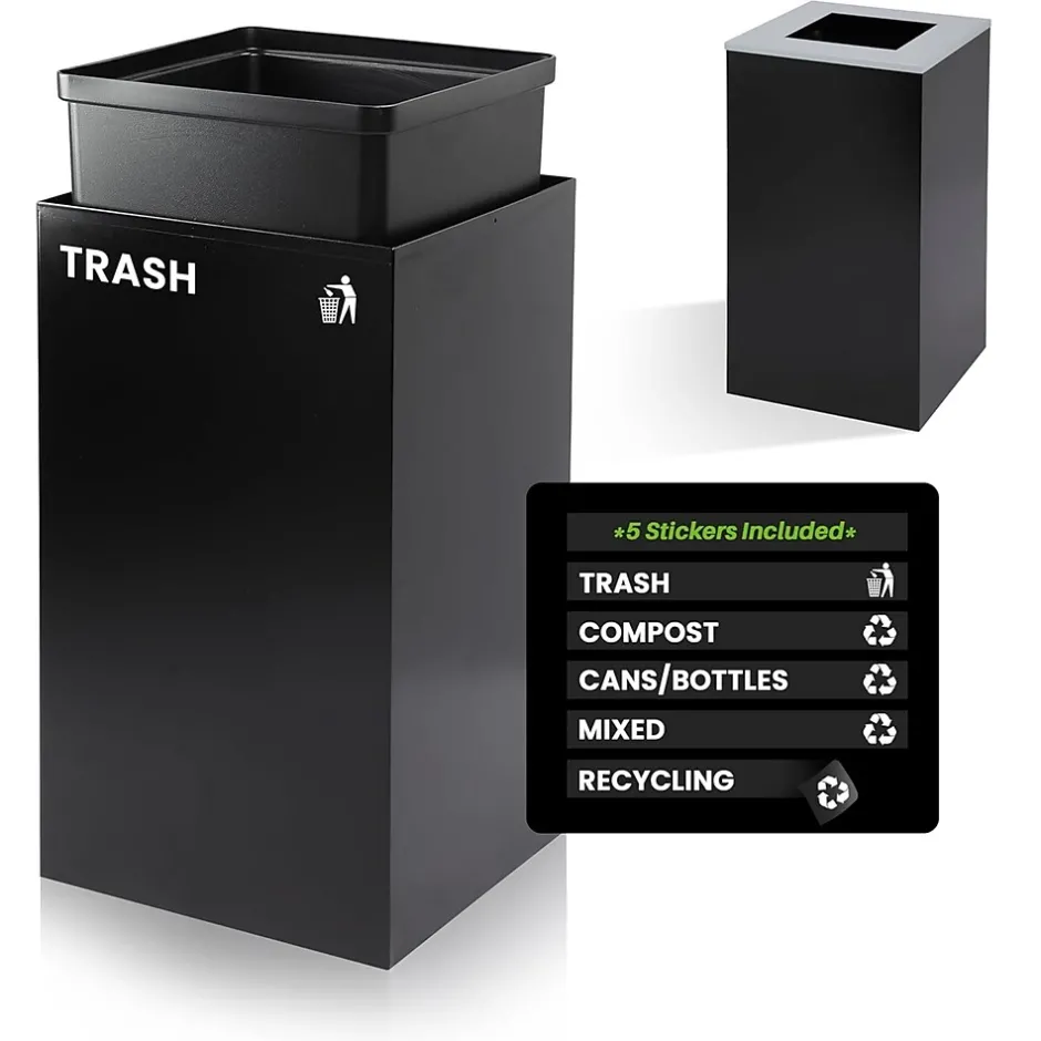 - Stickers included: Cans/Bottles, Compost, Mixed, Recycling, Trash
