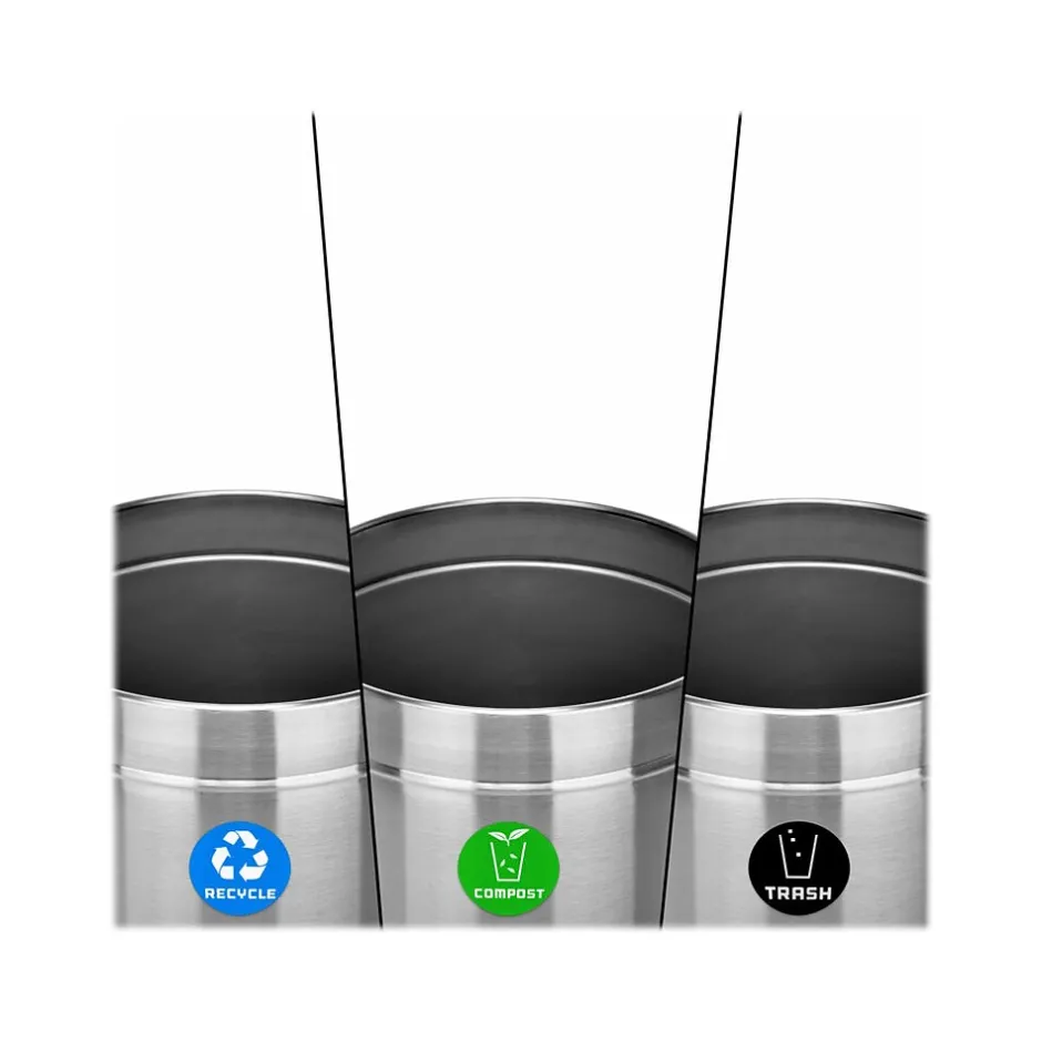 When equipping your business’s interior with waste receptacles, you want to be reassured it will survive constant daily use and also will aesthetically add to your environment. With our modern, multi-stream waste management 27 Gallon Stainless Steel Recycling, Trash, and Compost Stations, you can be confident you’re getting an everlasting product that will help maintain cleanliness in your facilities. To help accommodate a more significant amount of recycling, trash and compost, the 27-gallon capacity can fulfill your foot traffic demands. Included with every purchase is a recycling, trash and compost sticker that will identify its intended purpose and be able to handle daily wear and tear. The vibrant colors of the stickers offer optimal visibility, assuring waste goes into the proper stream. In addition, the lids of the receptacles are created to display a seamless design that conceals trash bags but can efficiently be removed when needed. The large open top design of the lid will also allow precise disposal of all forms of waste. Our 27 Gallon Stainless Steel Recycling, Trash, and Compost Stations will allow you to streamline waste collection in your high-traffic area while adding a touch of modern appeal.