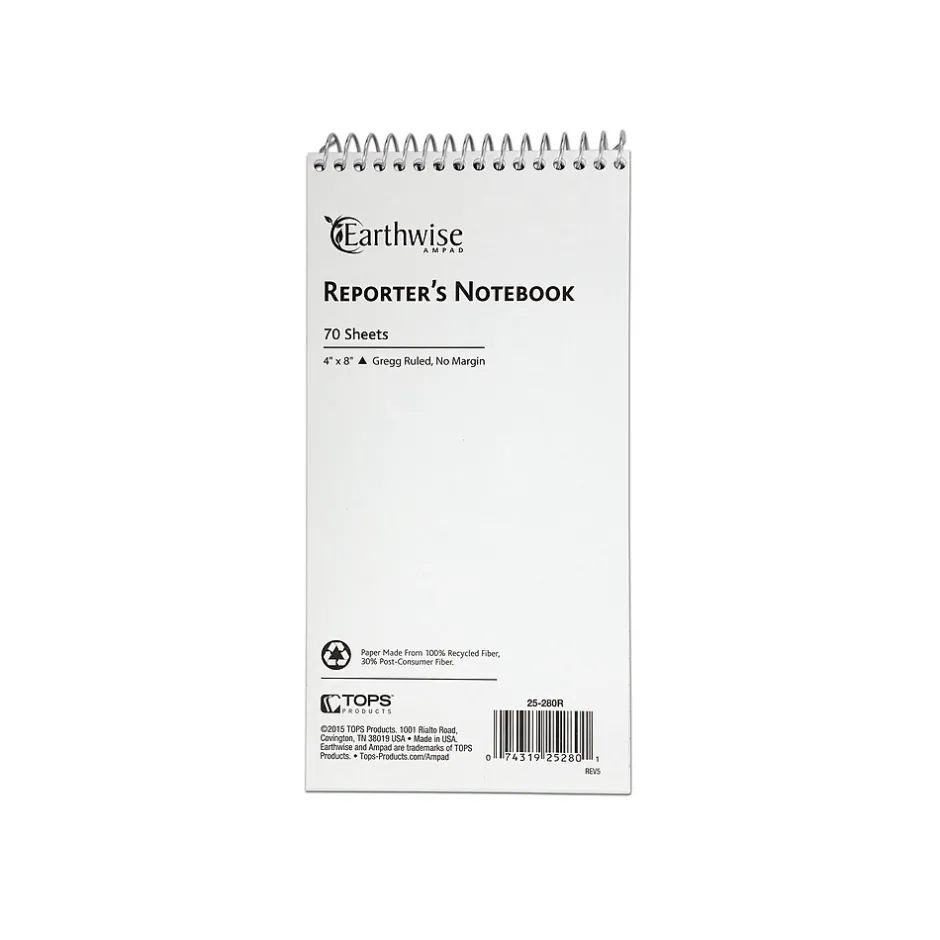 Make lists and write notes with this white reporter notebook. The Gregg ruling of this notebook lets you organize your notes efficiently, while the compact size makes it easy to store in a purse, bag or briefcase. Each Earthwise by Ampad reporter notebook has 70 sheets of paper and features a sturdy backing for writing notes while away from your desk.