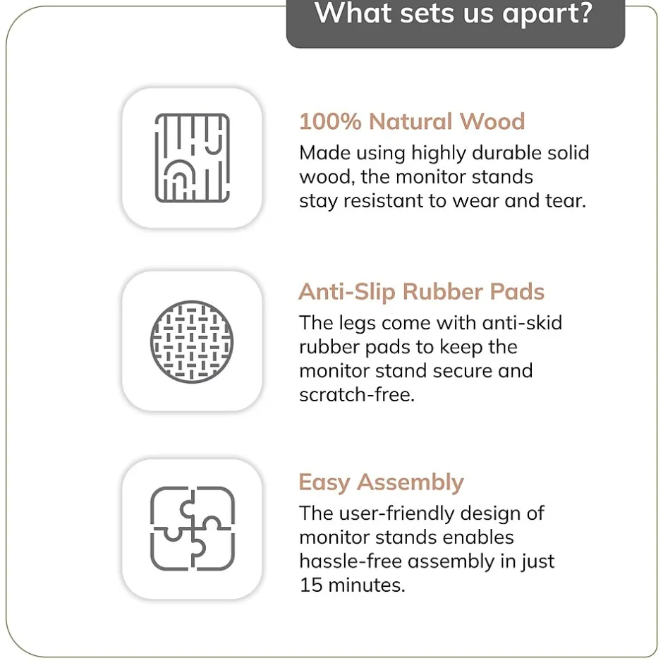 Upgrade your workspace aesthetic with Anji Mountain’s modern Monitor Stands, where style meets function. Our stands are more than just a place to put your monitor; they’re a statement piece that complements your design sensibilities while enhancing your comfort and productivity. Crafted from sustainably sourced mango wood with a sleek natural finish, our stands feature sturdy powder-coated steel legs for a modern, minimalist look. Elevate your monitor to an ergonomic height for reduced strain, while anti-skid EVA foam foot pads keep it securely in place. Invest in Anji Mountain and experience the difference a well-designed monitor stand can make in both your workspace and your well-being.