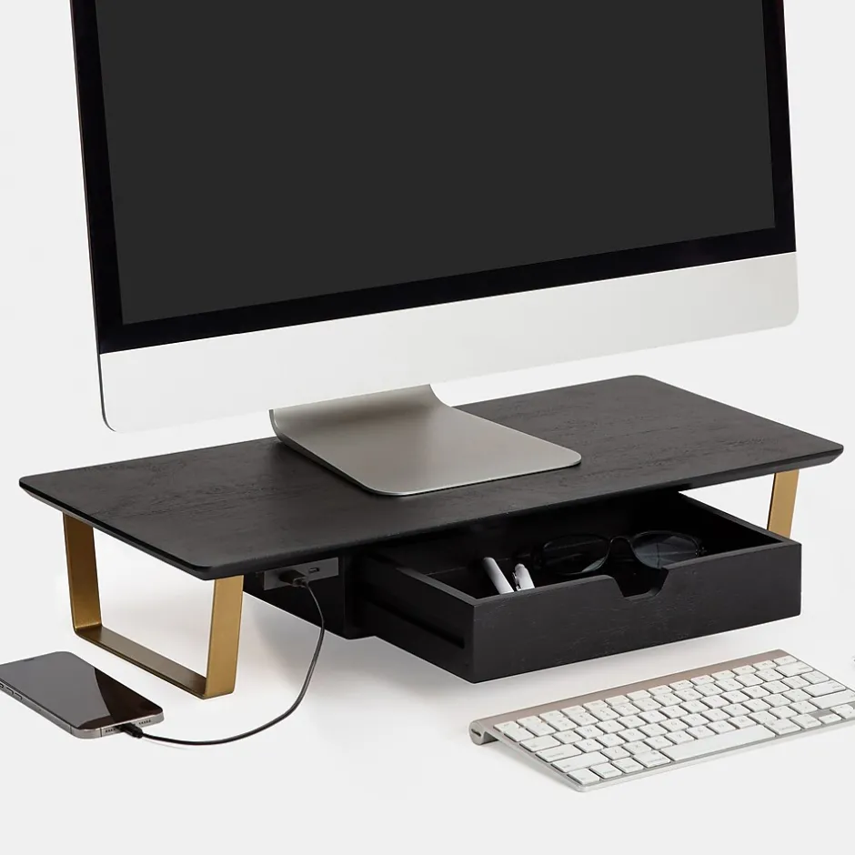 Tired of neck pain and clutter? Anji Mountain’s Monitor Stands are here to revolutionize your workspace. Our ergonomically designed stands feature a rich black stained acacia wood top and sturdy steel legs, elevating your monitors to the optimal height for reducing strain and discomfort. Say goodbye to a messy desk! The built-in drawer provides a convenient storage solution for your work essentials, helping you maintain a clean and focused workspace. Built-in dual USB outlets (Type A and Type C) for easy charging of your devices, streamlining your setup even further. Whether you’re a student, professional, or casual computer user, Anji Mountain’s Monitor Stands offer a simple yet impactful way to improve your comfort, productivity, and overall well-being. Upgrade your workspace today and experience the difference!