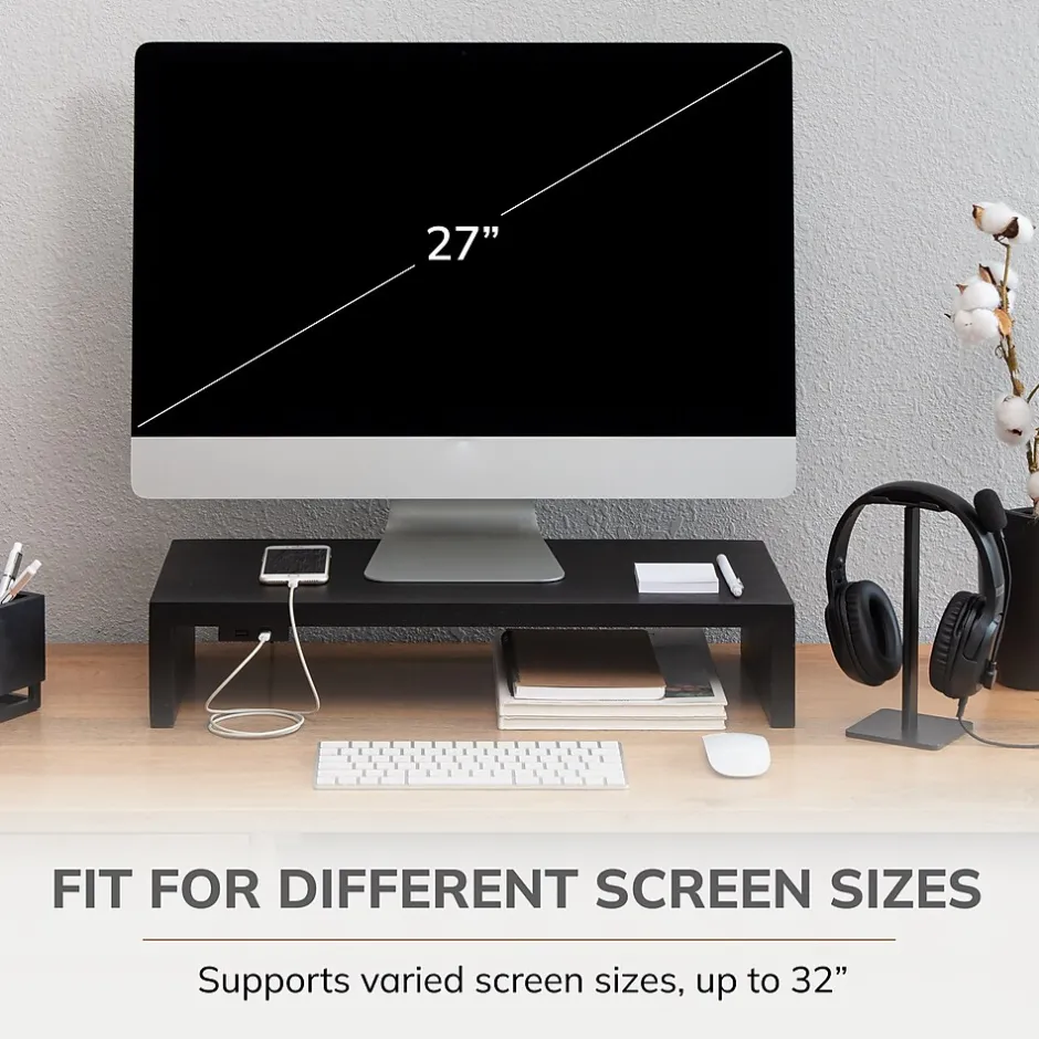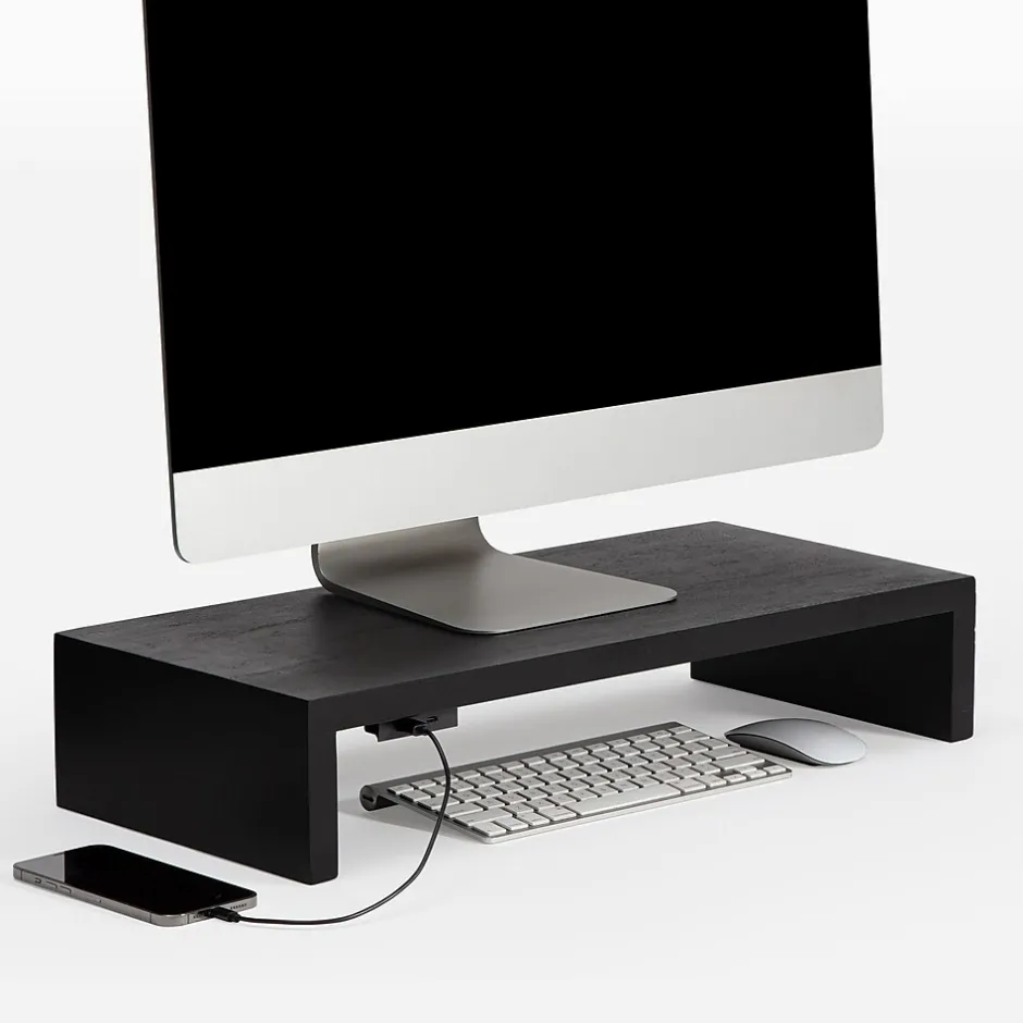Tired of a cluttered and uncomfortable workspace? Anji Mountain’s modern Monitor Stands are the solution you’ve been searching for. Crafted from sustainable and solid mango wood with a rich black finish, these stands boast a minimalist design with integrated legs that complement any décor. Enhance your comfort and productivity by elevating your screen to an ergonomic height, reducing neck and eye strain. The anti-skid EVA foam foot pads ensure stability, while the finger joint construction guarantees durability. This model is power-equipped featuring two USB outlets (one Type A, one Type C) and supports up to 22 pounds, helping you create the perfect workspace for your needs.Upgrade your workspace today with the modern elegance and functionality of Anji Mountain’s Monitor Stands.