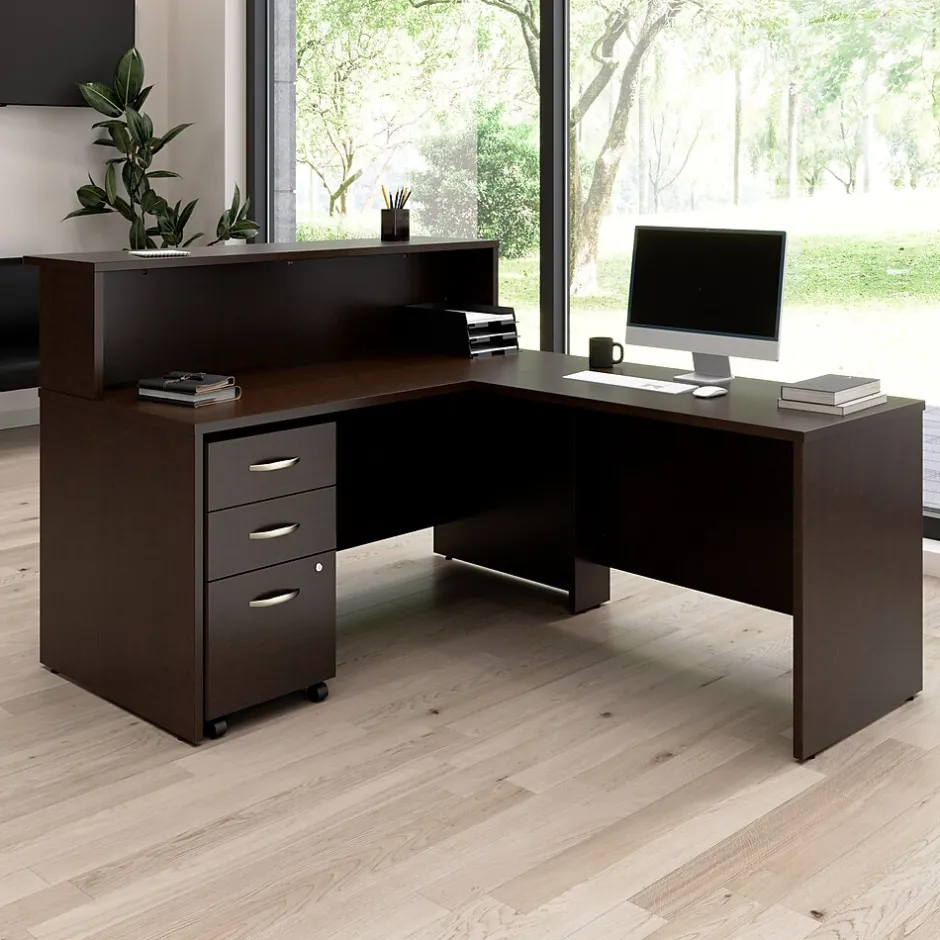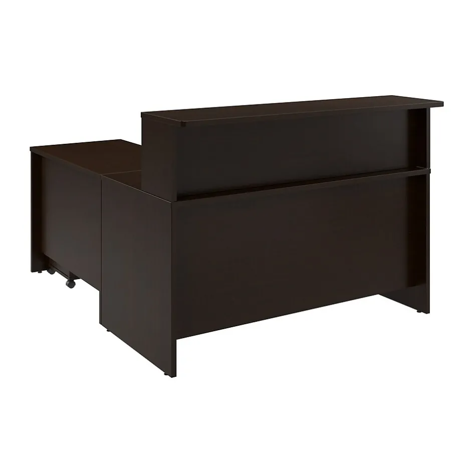 The Bush Business Furniture Arrive 60W x 72D L Shaped Reception Desk with Shelf and Mobile File Cabinet provides a stylish and practical solution for welcoming guests to your office’s waiting room. Greet clients, patients, and other visitors at a front desk that includes a raised shelf for signing in and completing paperwork. The durable thermally fused laminate surface protects against scratches and stains while a 200-pound weight capacity and built-in wire management grommets accommodate multiple monitors and other equipment. The rolling file cabinet features one drawer for letter, legal, and A4-size paperwork as well as two drawers for supplies. This commercial-grade L receptionist desk with drawers has been meticulously tested to meet or exceed ANSI/BIFMA standards for safety, durability, and performance and is backed by a 10 Year Warranty. American made with U.S. and imported parts.