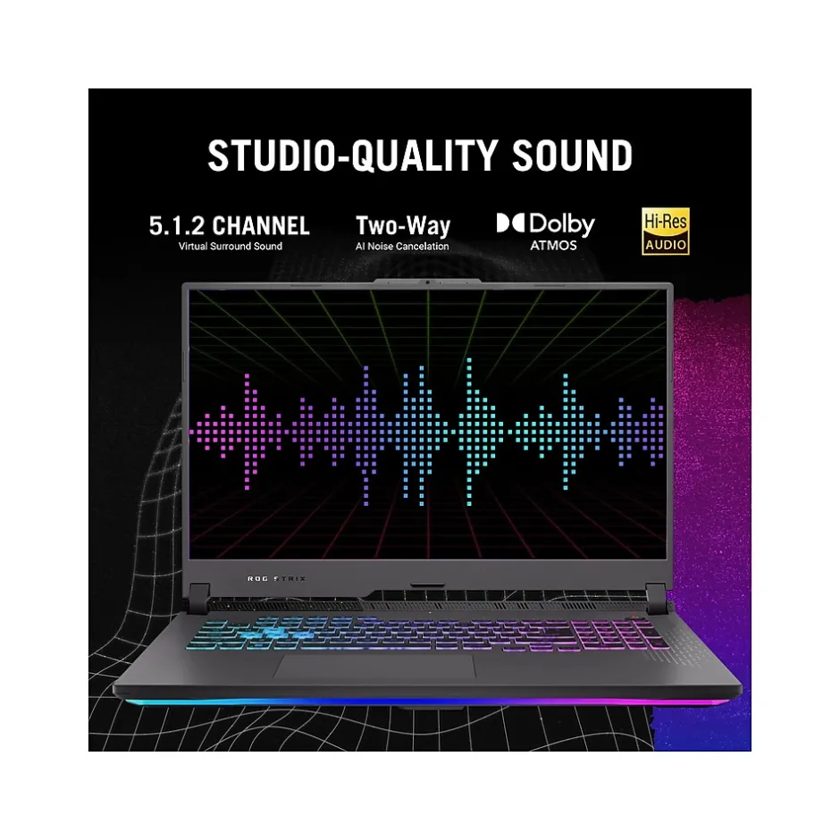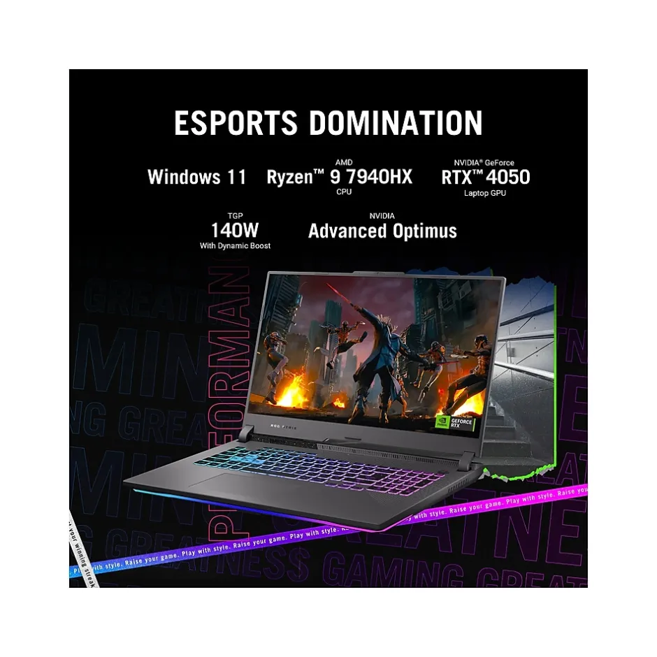 Raise your game and call the shots with the Asus ROG Strix G17, a powerful and sleek gaming laptop designed for esports domination. It features an AMD Ryzen 9 7940HX processor, an NVIDIA GeForce RTX 40 Series laptop GPU, and Windows 11 Home for optimal performance. With DDR5 4800MHz memory and PCIe 4×4 storage, multitasking and loading times are fast. The ROG Intelligent Cooling system, featuring Thermal Grizzly’s Conductonaut Extreme liquid metal on the CPU, ensures sustained performance during long gaming sessions. The FHD 144Hz panel supports NVIDIA G-SYNC for a stellar gaming and viewing experience. The MUX Switch with Advanced Optimus optimizes performance and battery life. The robust aluminum chassis in eclipse gray color adds a subtle yet striking design element to the machine.